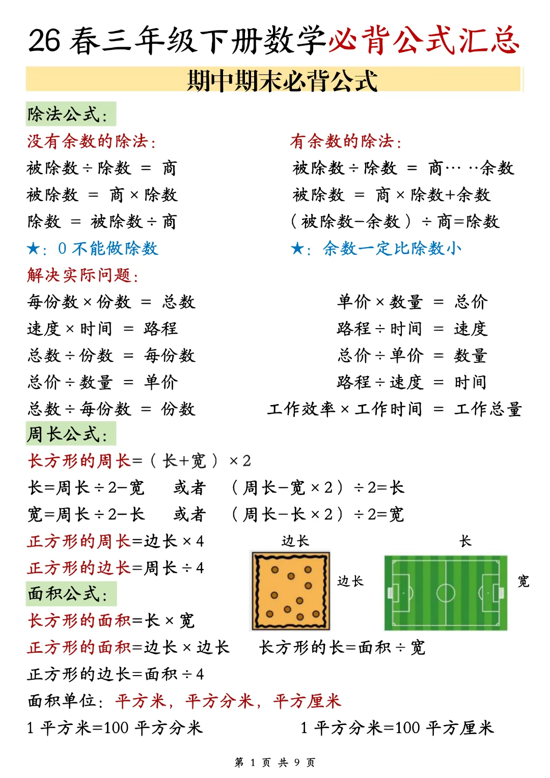 26春《三年级下册数学必背公式汇总》电子版可打印