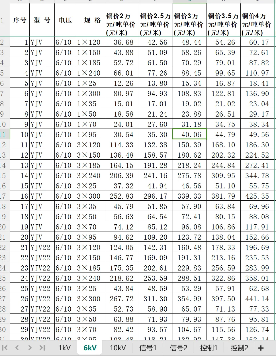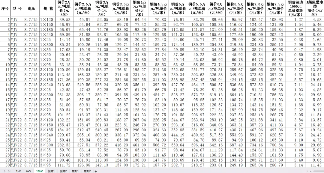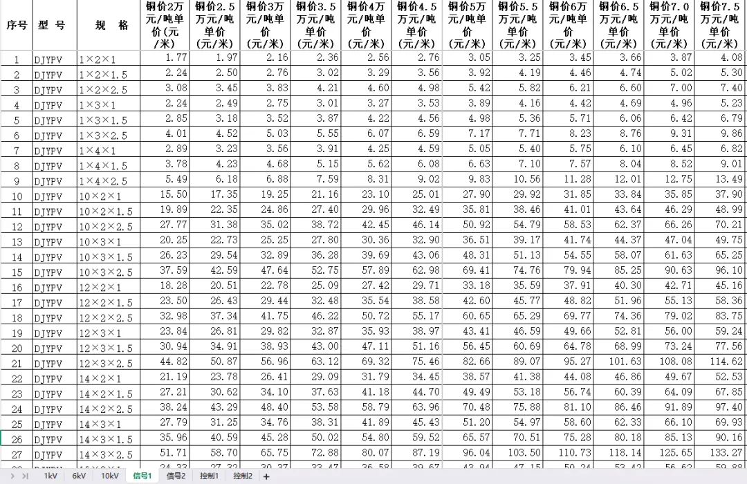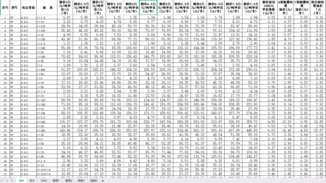 电缆价格计算表