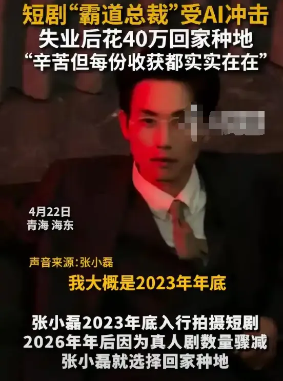 4月22日,一则新闻冲上热搜:曾参演近200部“霸总”短剧的演员张小磊,因AI生成内容冲击戏约中断,被迫回到青海老家投入40万元种地,面对镜头,他苦笑着说出那句“有戏拍戏,没戏种地”,瞬间戳中无数网友的心——这不仅是个人命运的转折,更是一代普通人在技术洪流下的生存缩影。