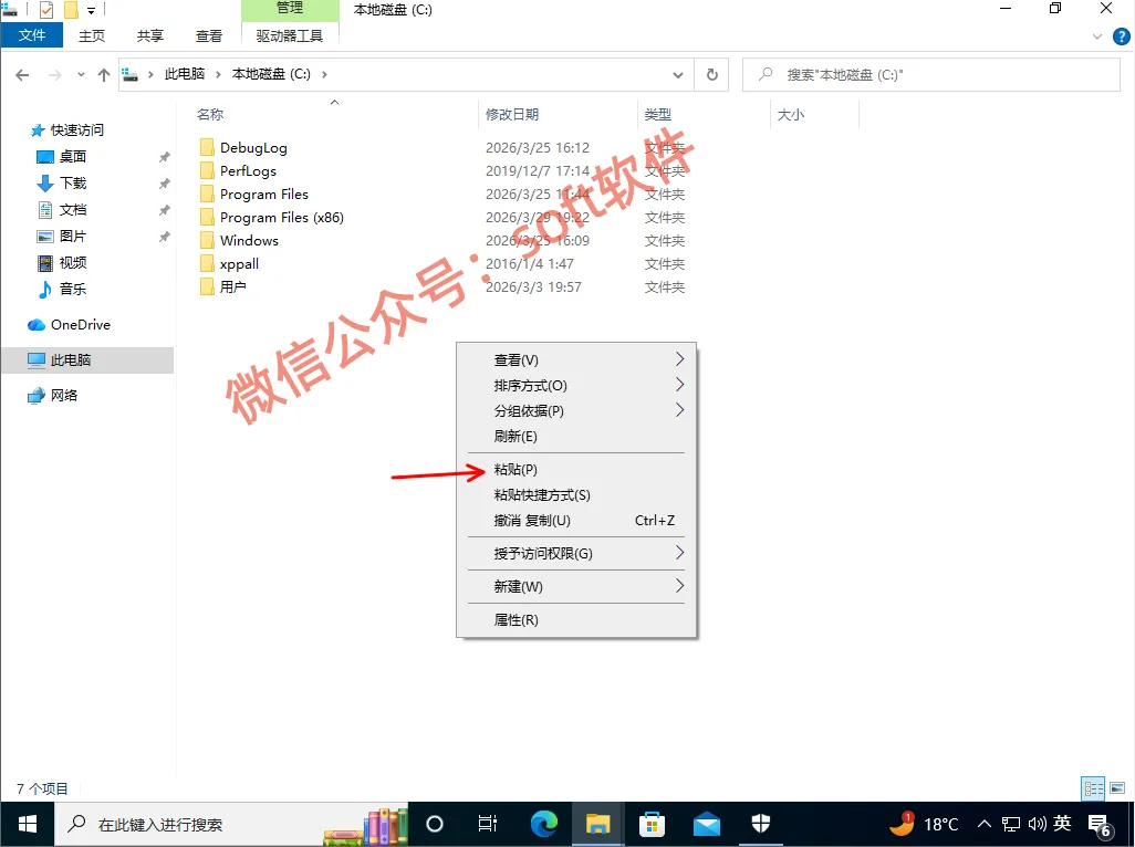 4,打开C盘,在空白处鼠标右键,选择粘贴。