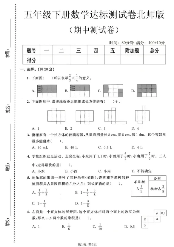 五年级下册数学期中达标测试卷北师大版附答案,电子版可打印 今天分享的是五年级下册数学期中达标测试卷北师大版附答案,提供电子版,支持打印和下载。 (温馨提示:文末有完整电子版领取方式) 免费领取完整电子版: ①:关注下方公众号:学习升华网 ②:在公众号对话框中回复:5083 重要事情说三遍: 关注公众号《学习升华网》,在公众号后台回复代码,不是在文章里面留言!! 关注公众号《学习升华网》,在公众号后台回复代码,不是在文章里面留言!! 关注公众号《学习升华网》,在公众号后台回复代码,不是在文章里面留言!!