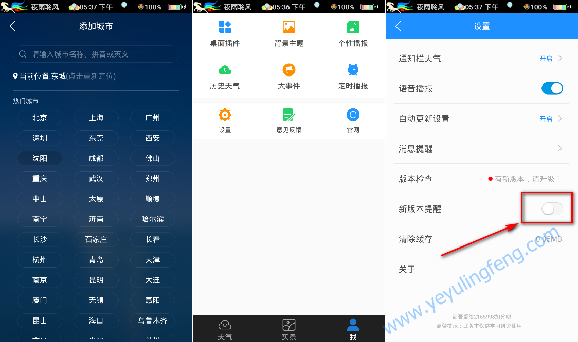 因为软件官方版本更新较快,大家在安装使用后请第一之间至设置页面将“新版本提醒”以及“自动更新设置”这两项关闭,软件都是从云端获取天气数据,日后的更新也仅仅是功能上的完善并没有太多区别,若自动更新升级将不再享有无广告体验,请须知。软件在老夜测试使用中均无发现广告残余,可谓是非常的干净清爽,至于最美天气功能这里就不用详细为大家说明了,作为从爱酷天气用到到最美天气的骨灰级老用户,天气实时查询、语音播报、天气指数、出行指数等诸多功能也是为广大市民带来了便利。