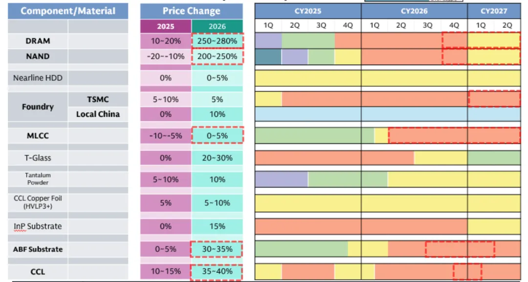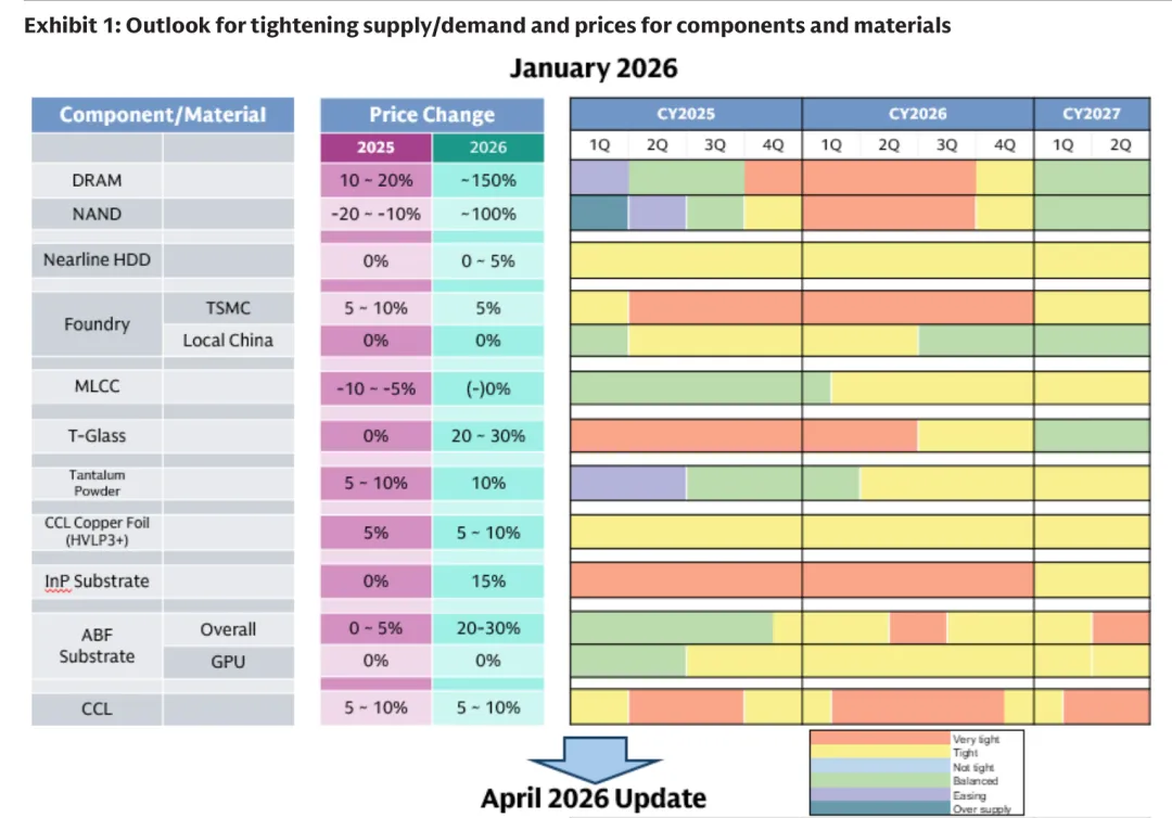 *高盛2026年4月更新版供需热力图:红色虚线框标注了五大关键上调——DRAM、NAND、MLCC、ABF基板、CCL的涨价预期和供需紧张程度全面上修*
