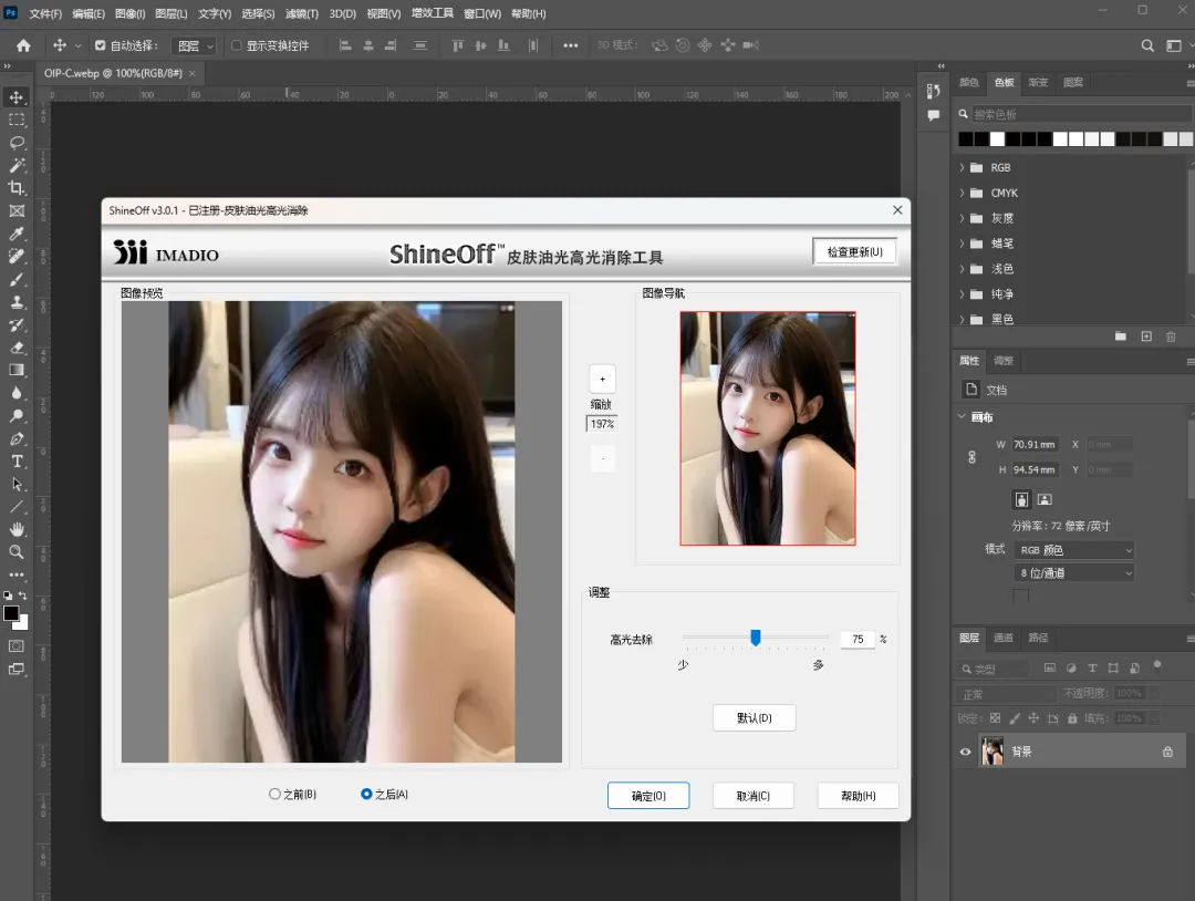PS汉化插件|Imadio ShineOff v3.0.1,快速精修皮肤,质感上乘,一键成片!