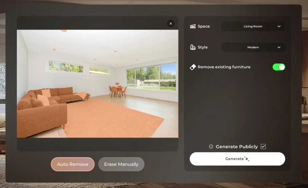 快速为未装修的新房或空置房源生成虚拟样板间效果图。用于楼盘宣传和销售展示。
