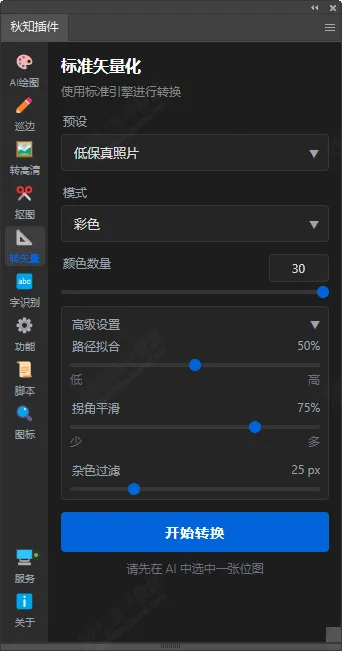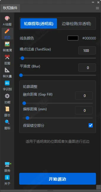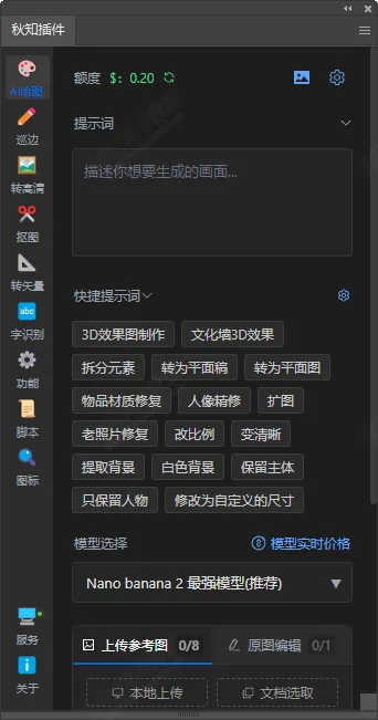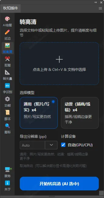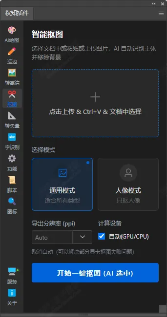 AI秋知插件V4.1的功能涵盖了从基础绘图到高级处理的各个方面。自动巡边功能能够智能识别图像边缘,大大简化抠图流程;智能抠图则进一步提升了抠图的准确性和效率,无论是复杂的背景还是细微的毛发,都能轻松应对。转高清功能则能让你的图像在放大后依然保持清晰细腻,满足各种印刷和展示需求。