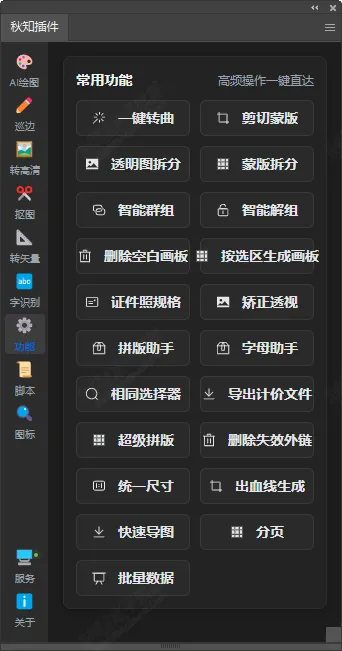 针对设计师们日常工作中频繁使用的功能,AI秋知插件V4.1特别设计了常用功能面板。一键转曲、剪切蒙版、透明图拆分、蒙版拆分等高频操作都可以在这里一键直达,无需再在繁琐的菜单中寻找,大大提高了工作效率。