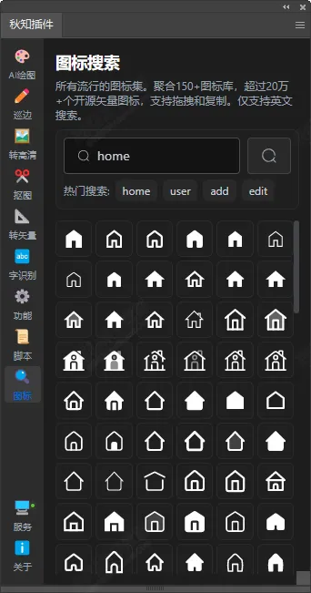 在设计过程中,图标是不可或缺的元素之一。AI秋知插件V4.1内置了图标搜索功能,聚合了150+图标库,超过20万个开源矢量图标供设计师们选择。只需在搜索框中输入关键词,即可快速找到符合需求的图标,并支持拖拽和复制到设计文件中,让灵感触手可及。