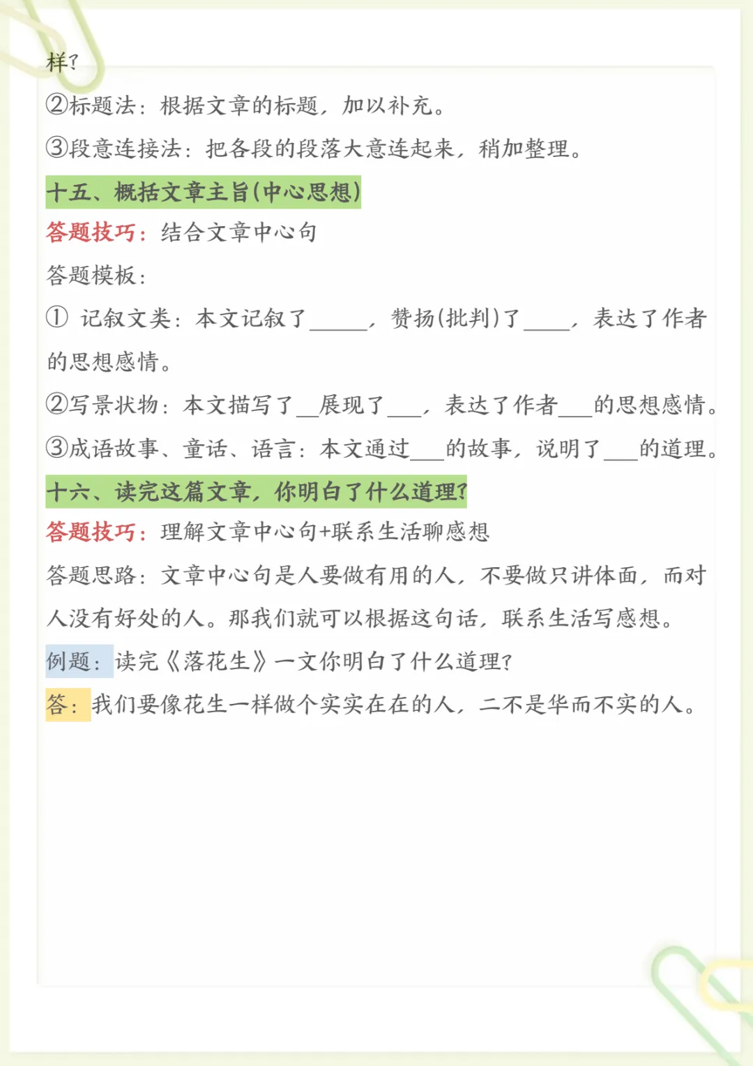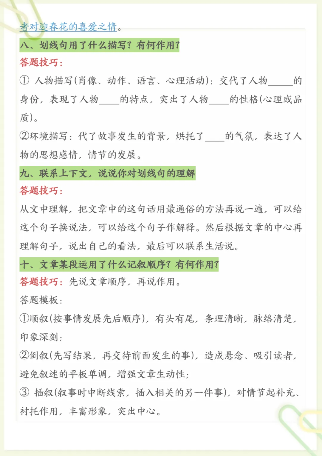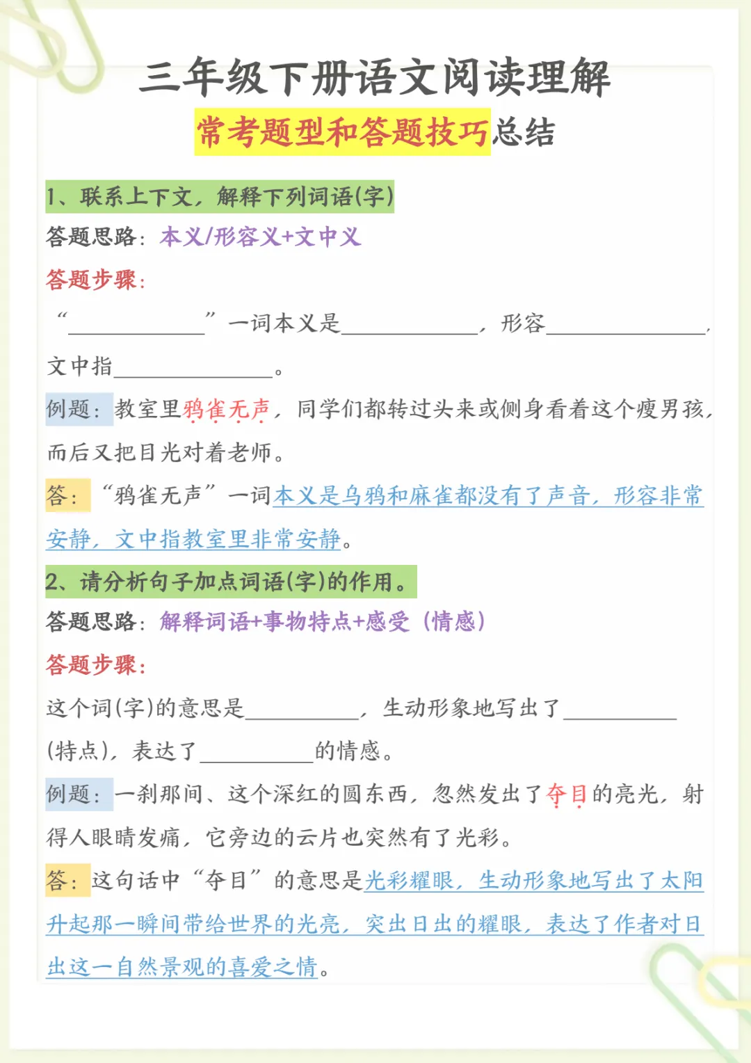 三年级下语文阅读理解常考题型和答题技巧,电子版可打印