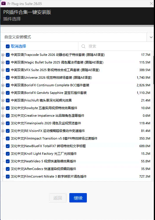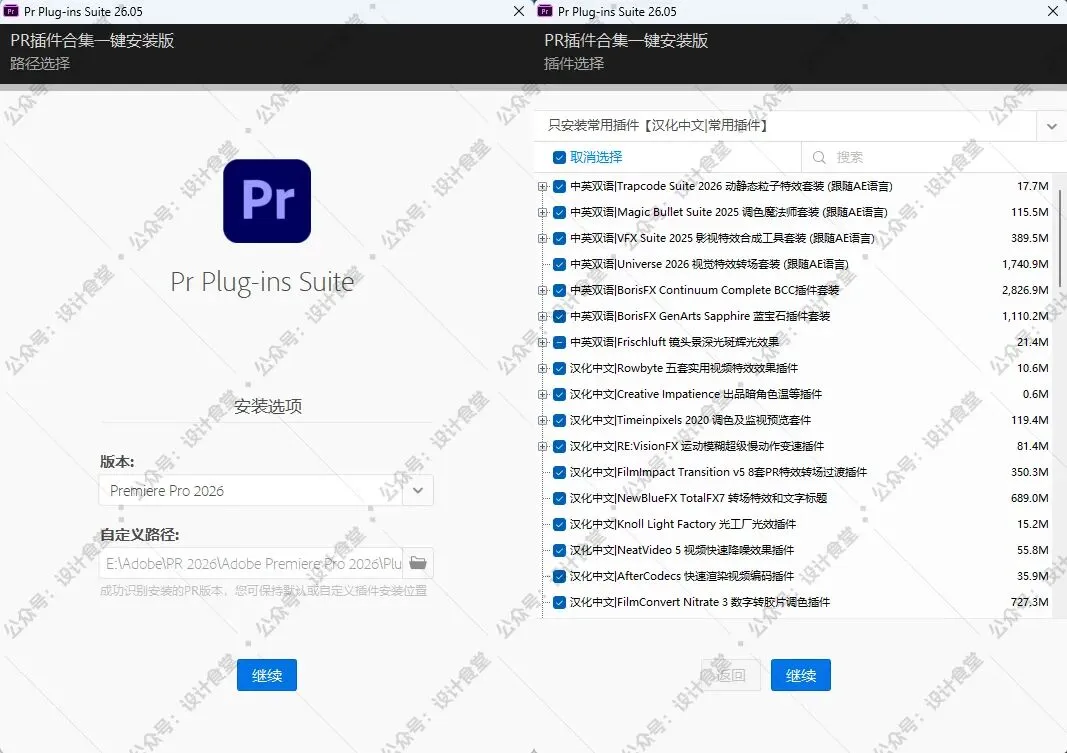它不仅支持最新的 Premiere Pro 2026,更集成了市面上几乎所有主流的商业插件,一键安装,自动识别路径,让你把精力全部集中在创作上!