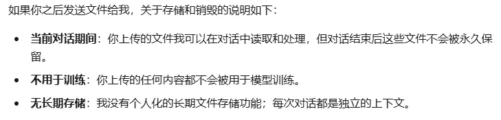 询问AI是否保存文件,什么时候销毁。AI答复如下: