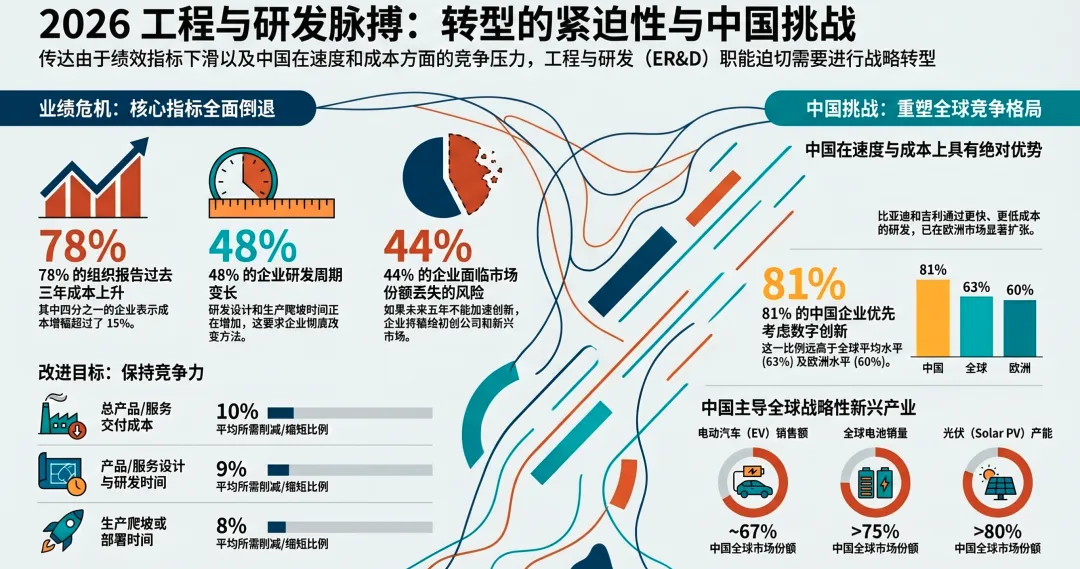 目前全球工程体系正同时面临机遇和挑战,而且这种机遇与挑战在不同区域呈现出明显差异。报告中提到,44%的企业认为如果未来五年不能加快创新,就可能失去显著市场份额;78%的企业表示过去三年成本上升;48%的企业表示开发周期变长。第一次看到这些数据时,我其实是有些怀疑的,因为从国内尤其是新能源汽车行业来看,我的直观感受是开发节奏明显在加快,而不是变慢。