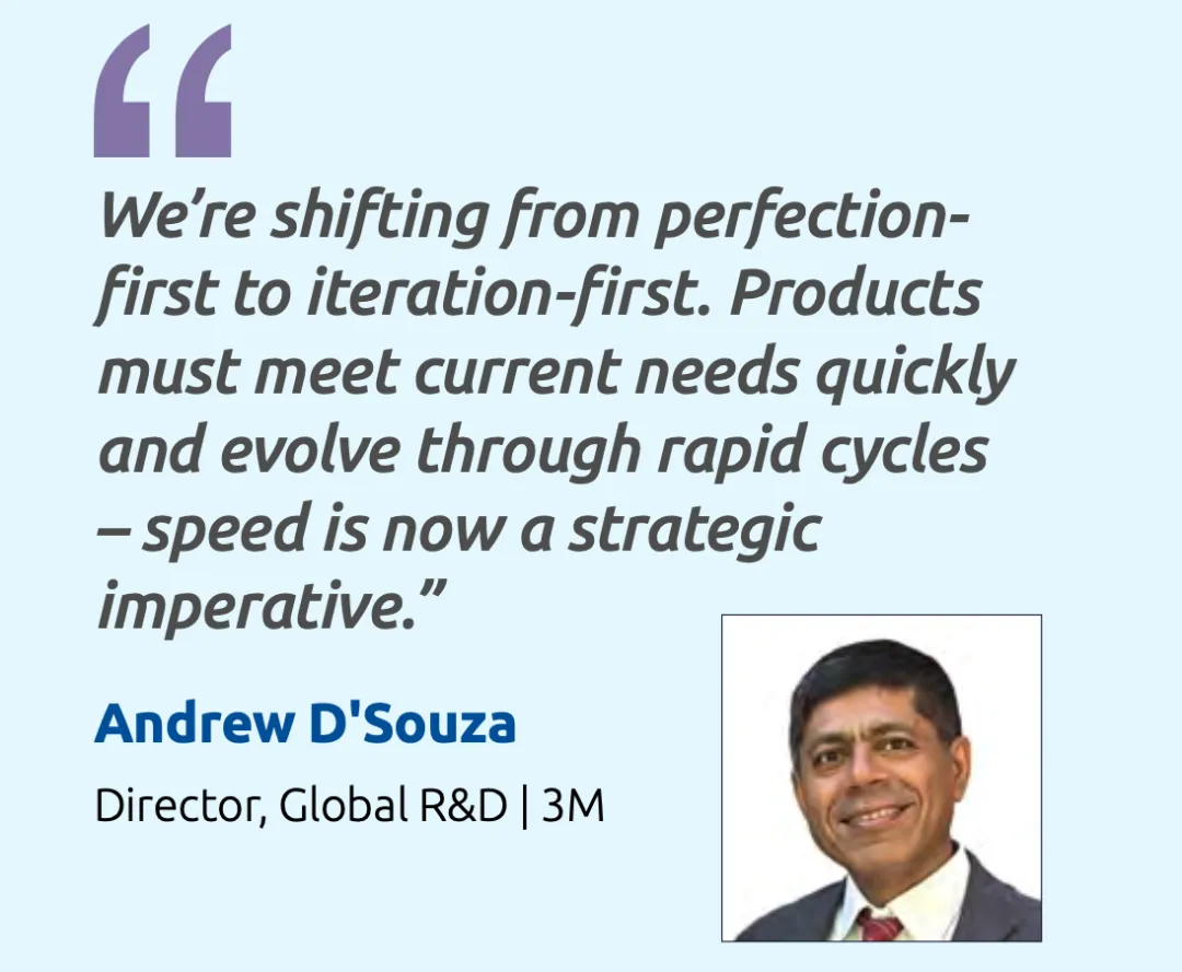 后来我逐渐意识到,这种差异来自所处环境的不同。我刚好身处中国市场,而且上一家公司也处在行业领先位置,因此更容易感受到效率提升的一面。但如果站在欧美传统企业的角度,他们过去积累的大量流程、系统和验证体系,在需求变化较慢的时代是优势,而在当前快速迭代的环境下,反而可能成为负担。本质上,这是工程体系的一次代际切换——从强调一次做到完美,转向强调快速迭代和持续演进。报告中提到,3M全球研发负责人也明确表示,他们正在从”perfection-first”转向”iteration-first”,这对我触动很大。