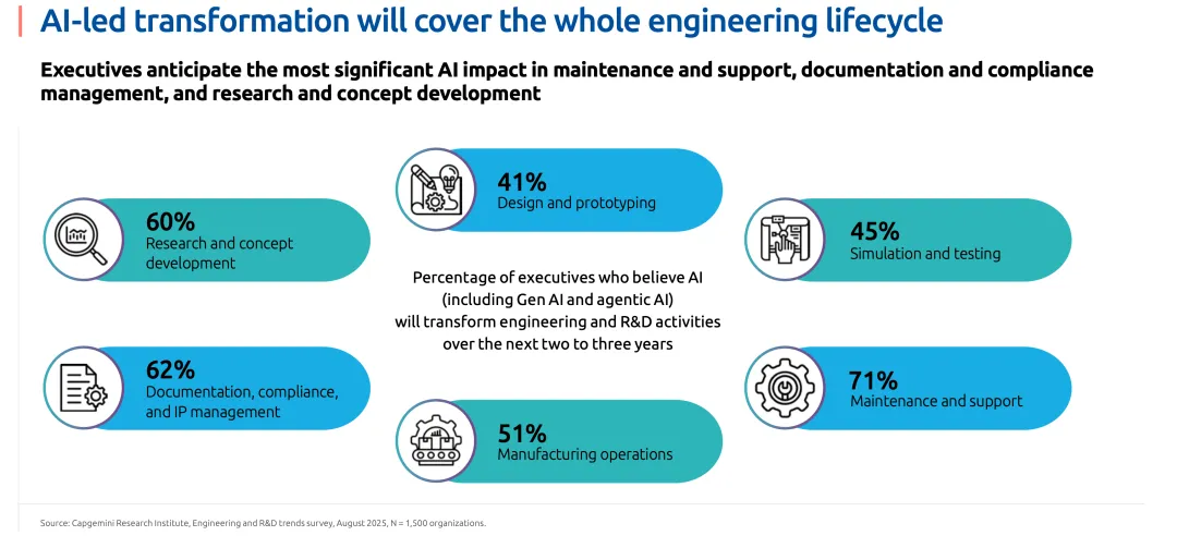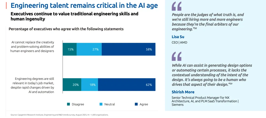 这两天我连续读了两份关于AI与工程研发的报告。一份来自德勤,更多讨论AI如何进入物理产品创新;另一份来自凯捷研究院,更系统地调研了全球工程与研发体系在AI时代面临的压力和转型方向。这两份报告放在一起看,让我有一个很强的感受:AI时代,工程师真正要升级的,不只是工具,而是自己的工程系统能力。