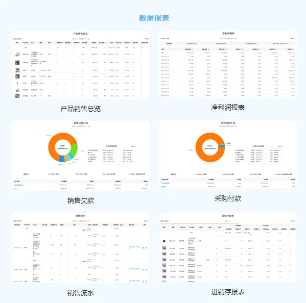 想知道那个产品好卖,打开【产品销售总览】;想知道店铺的盈亏情况,查看【净利润报表】;应付应收款情况,查看【销售欠款】和【采购付款】;了解交易情况,查看【销售流水】;出入库数据,直接看【进销存报表】
