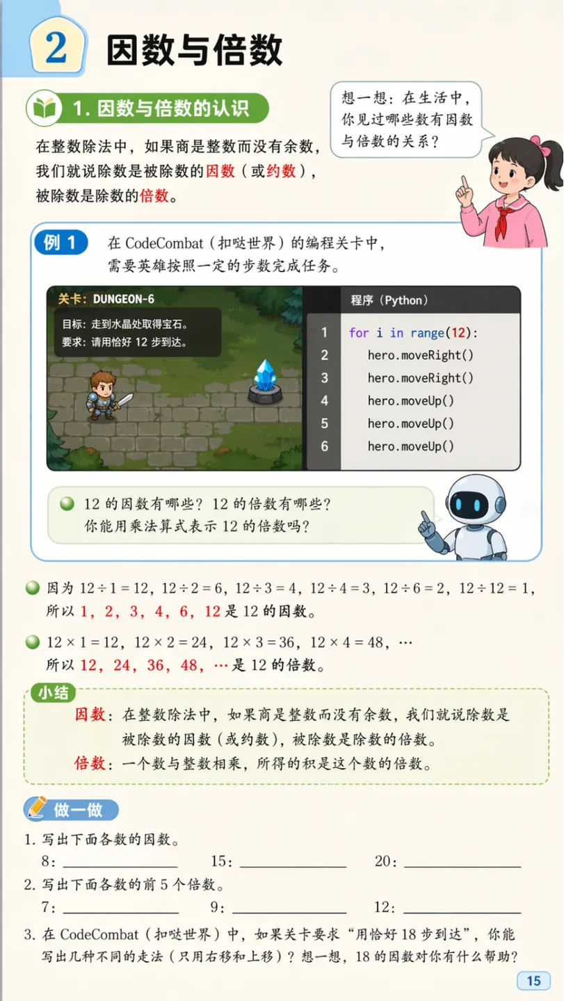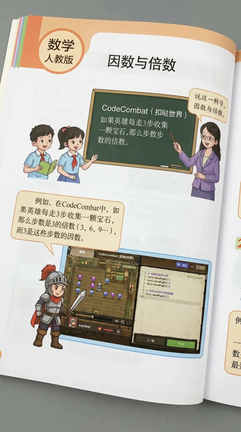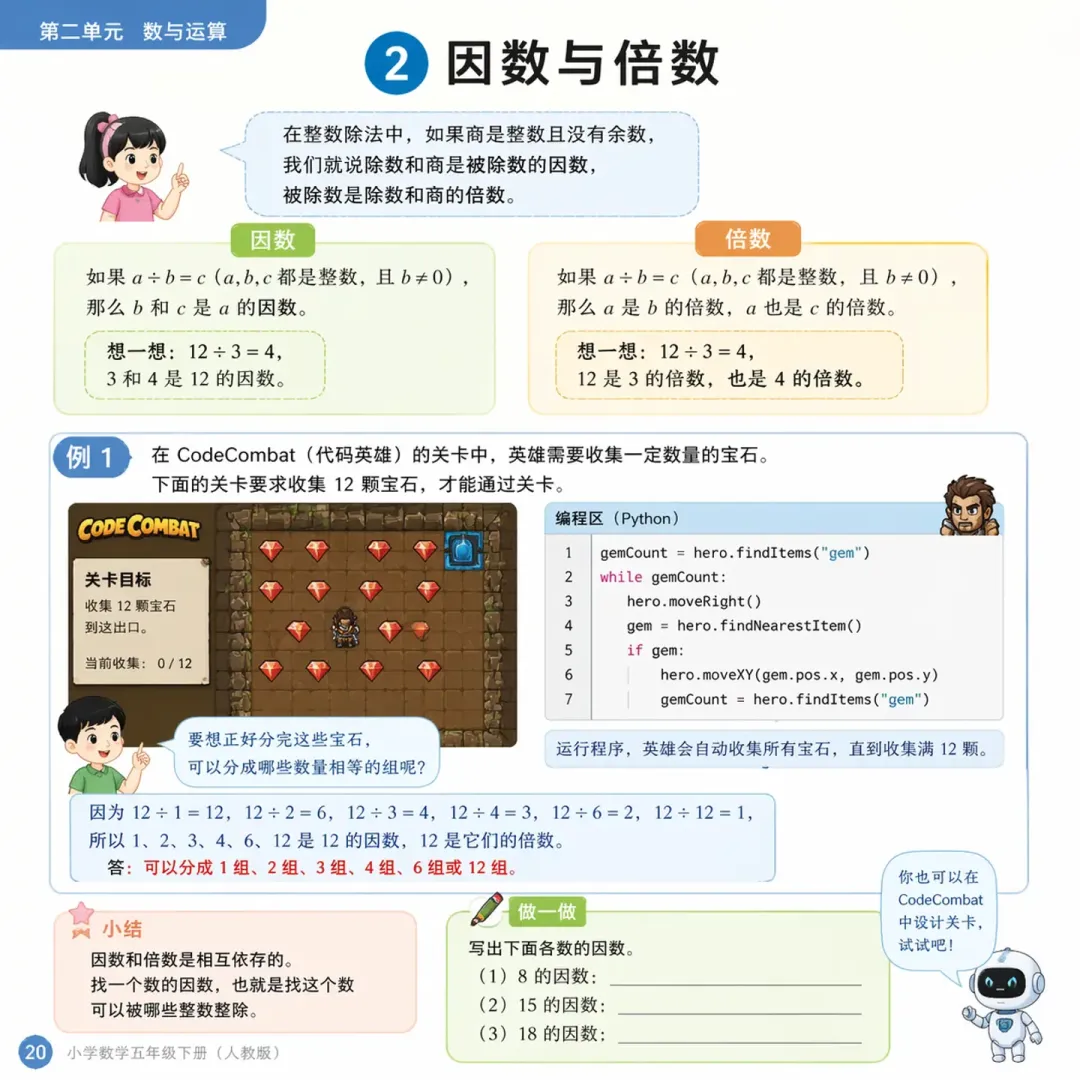 但仔细看——课本中间出现了一个游戏画面:一个小英雄站在地牢入口,面前散落着宝石,旁边还有一段Python代码。知识点讲的是”把12颗宝石均等分组,有几种分法”,用游戏闯关的方式把因数与倍数的概念讲得清清楚楚。