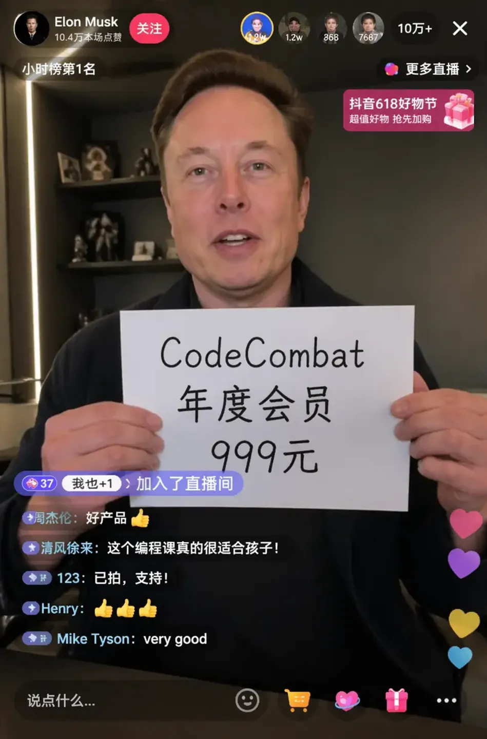 马斯克在抖音直播间带货编程课。小时榜排名、618促销标签、购物车入口、评论区的”已拍,支持”——每一个UI细节都和你每天刷的抖音直播一模一样。当然是假的,但你是不是差点就信了?