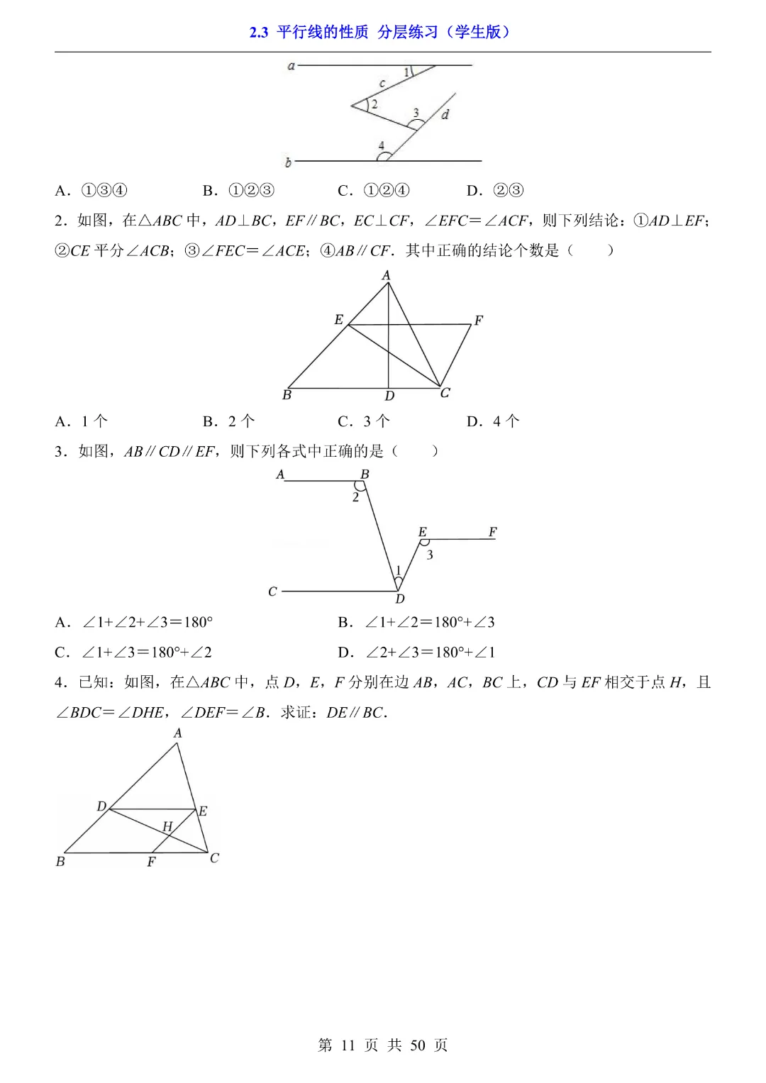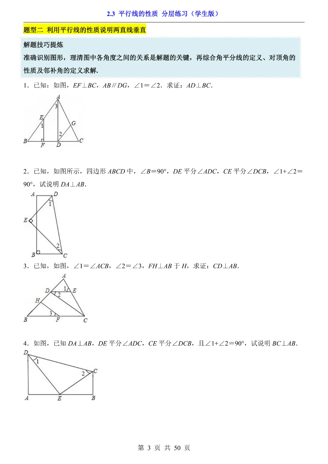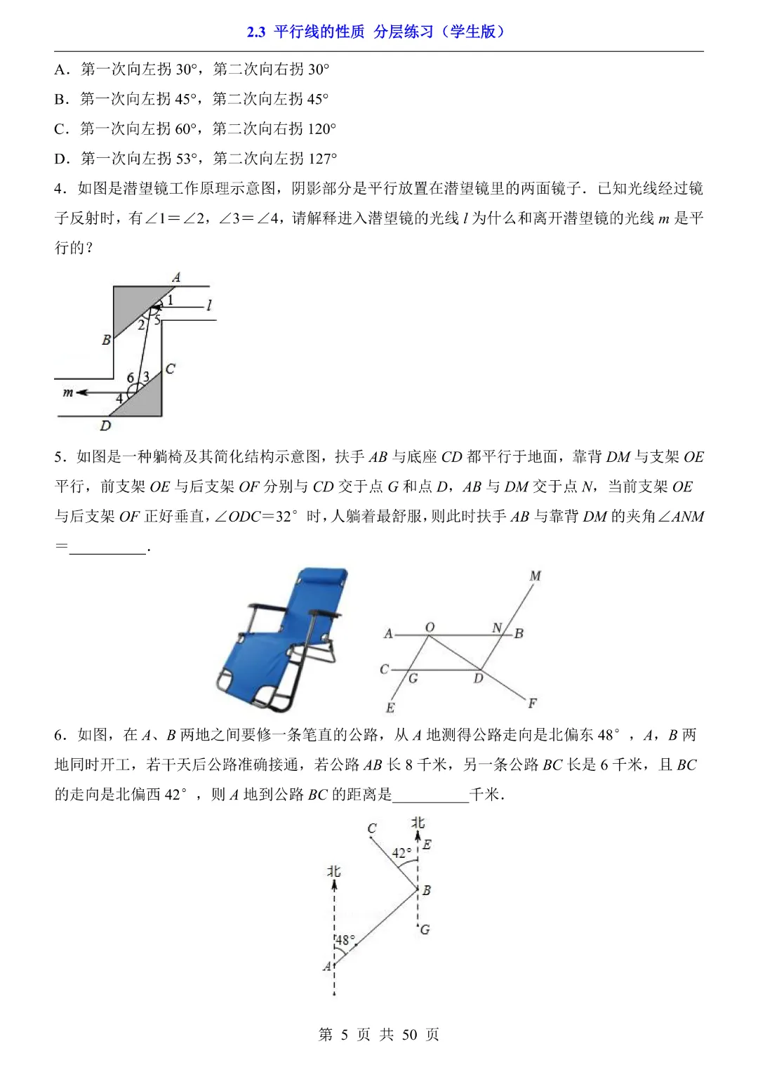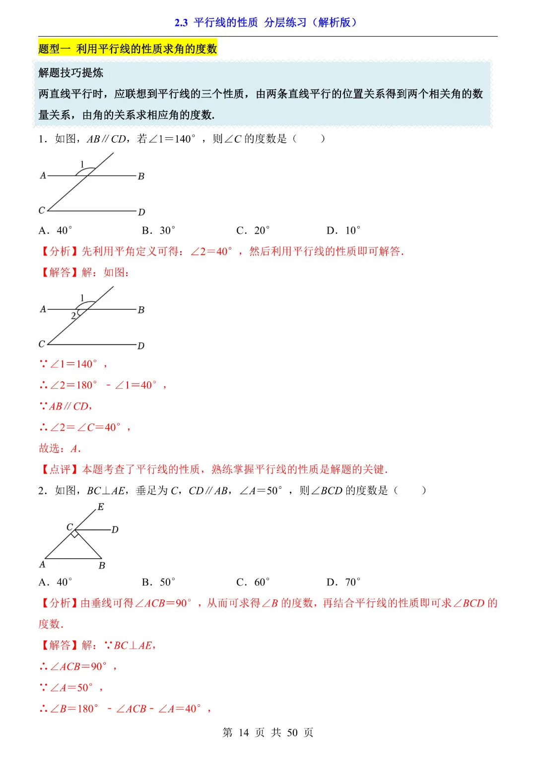 【七年级下册数学】【北师大版】2.3 平行线的性质分层练习带答案|完整高清可打印