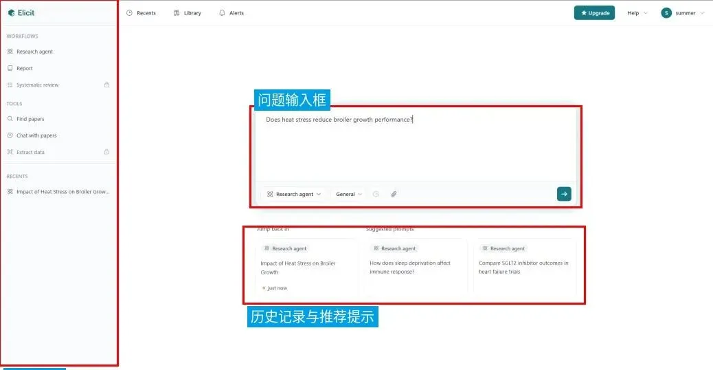 工具简介:Elicit支持直接输入完整研究问题,而非零散关键词,能够围绕问题搜索海量学术论文,并生成结构化结果表。此外,还提供搜索、研究报告、系统综述、文献库和提醒等功能。