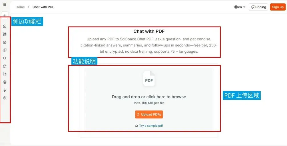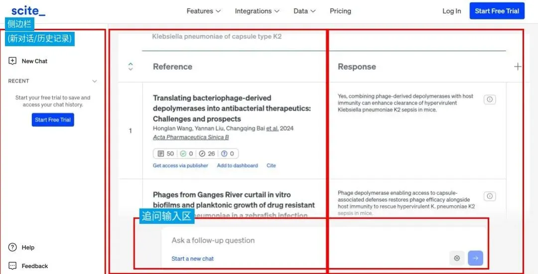 工具简介:SciSpace主打 Chat with PDF(与 PDF文档智能对话),可以直接围绕上传的论文提问,并根据论文内容返回回答和引用位置,适合用来快速抓实验设计、结果和关键表述,并且官方页面和帮助页明确把 Chat with PDF 作为核心功能之一。
