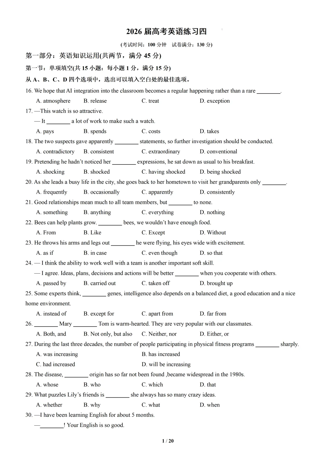 【可下载】2026高考英语二模模拟试题四(附解析) 点击上方“蓝字”免费关注! 本套试卷完整版+答案解析下载入口 关注“卿卿侃古今”公众号 点击左下角阅读原文可下载 相关链接: 2007-2025年天津市高考英语真题汇总(持续更新中~) 2011-2023年天津高考英语听力真题在线测试 【高考英语听力在线测试】高考听力机考模拟试题大全(持续更新中) 【可下载】2025-2026年高中英语试题汇总(附解析)【持续更新中】 【汇总】高中英语月考和期中期末试题(持续更新中~) 【题库】高一英语试题汇编(持续更新中~) 【题库】高二英语试题汇编(持续更新中~) 【题库】高三英语试题汇编(持续更新中~) 【可下载】高三英语上学期期末试题16套(附解析) 【可下载】高二英语上学期期末试题10套(附解析) 【可下载】高一英语上学期期末试题汇9套(附解析) 【可下载】2025-2026学年度高一高二高三开学考试模拟试卷(天津专用)(附解析) 新外研版高中英语高清电子课本、课文原文和译文、单元同步复习资料和试题【持续更新中】 【目录1】高中英语阅读理解限时训练大全(持续更新中~) 【目录2】高中英语完形填空限时训练大全(持续更新中~) 【目录3】高中英语书面表达大全(持续更新中~) 【目录4】高中英语听力训练大全(持续更新中~) 【目录5】高中英语单选题大全(持续更新中~) 【目录6】高中英语语法题大全(持续更新中~) 【目录7】高中英语阅读表达题大全(持续更新中~) 【目录8】科普知识汇总 【目录9】中高考学法知识汇总 【目录10】高考英语真题+名校模拟真题+月考和期中期末试题(持续更新中~) 【目录11】暑期高考英语备考资料大全持续更新中~【汇总】中高考志愿填报资料大全 【汇总】高中英语月考和期中期末试题(持续更新中~) 【汇总】2026届高三英语一模试题(附解析) 【汇总】2025届高三英语一模试题(附解析) 【汇总】2025届高三英语二模试题(附解析) 【汇总】2025届高三英语三模试题(附解析) 【汇总】2024届高三英语一模二模三模试题(附解析) 【汇总】2024届高考英语押题卷(附解析) 【汇总】2025届高三英语周考综合练(附解析) 【题库】高三英语限时训练(持续更新中~) 【模拟】2025届高三英语听力机考模拟试题在线测试 【高考词汇】(新)外研版高中英语全七册词汇表(附音频) 【中考词汇】初中英语外研版必备单词表(完整版),可打印 建议收藏保存 点击阅读原文查更多