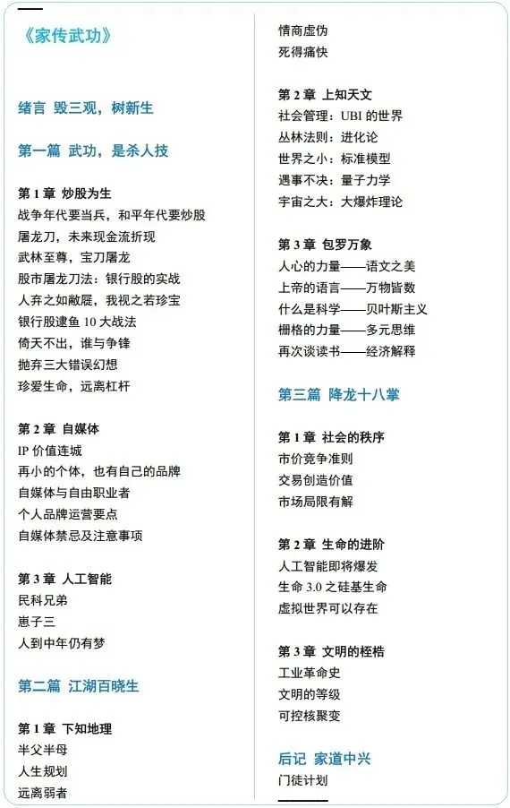 所以,我们看《家传武功》的目录框架:如果第一篇《武功,是杀人技》是教人如何赚钱立足的“术”;那么,第二篇《江湖百晓生》就是思维框架的“用”了;第三篇《降龙十八掌》,则是大佬刘家传武功的“体”了。