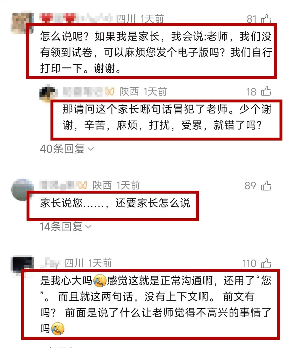 “家长全程用‘您’称呼老师,语气平和,只是直白地转达孩子的诉求,没有命令的口吻,也没有不礼貌的表述,反观老师,不仅不反思自己漏发试卷的问题,还揪着‘客气话’不放,当众指责家长,情绪管理实在堪忧。”
