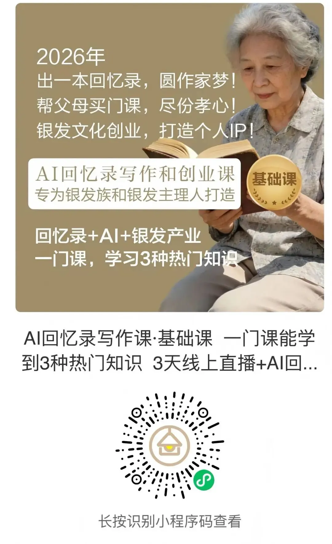 其实啊,这些顾虑,我们都懂。也正因为如此,我们推出了 “AI 回忆录写作课”,用 AI 技术降低写作门槛,用专业指导解决创作难题,让每个想写回忆录的人,都能轻松实现 “把人生故事写成书” 的愿望。