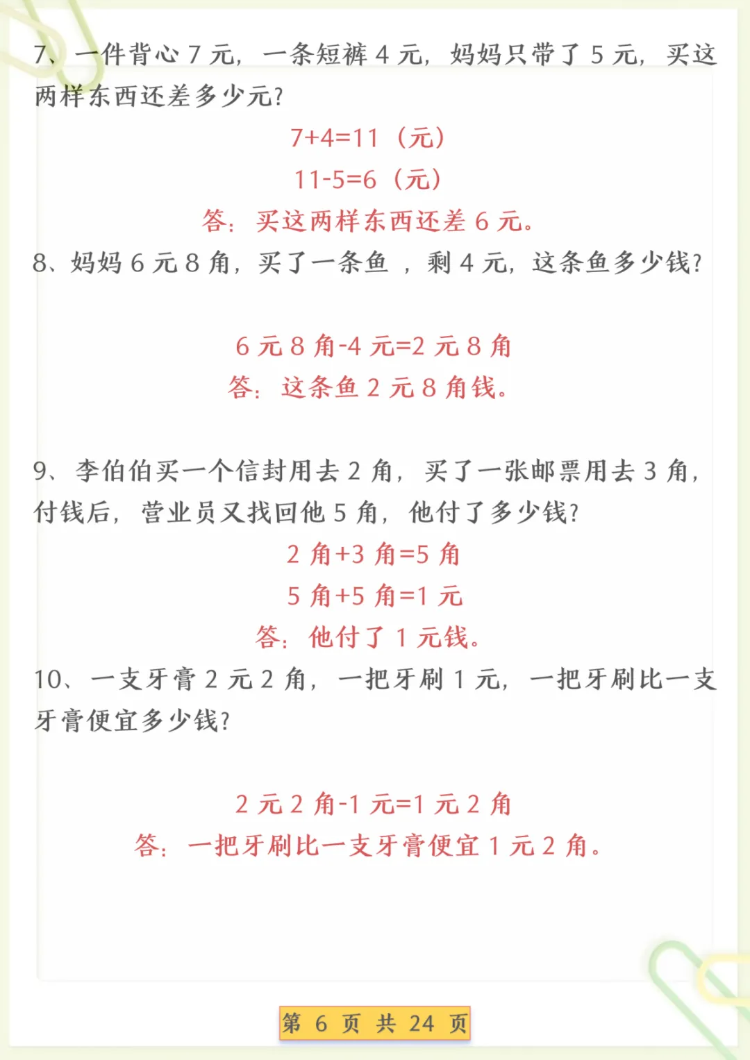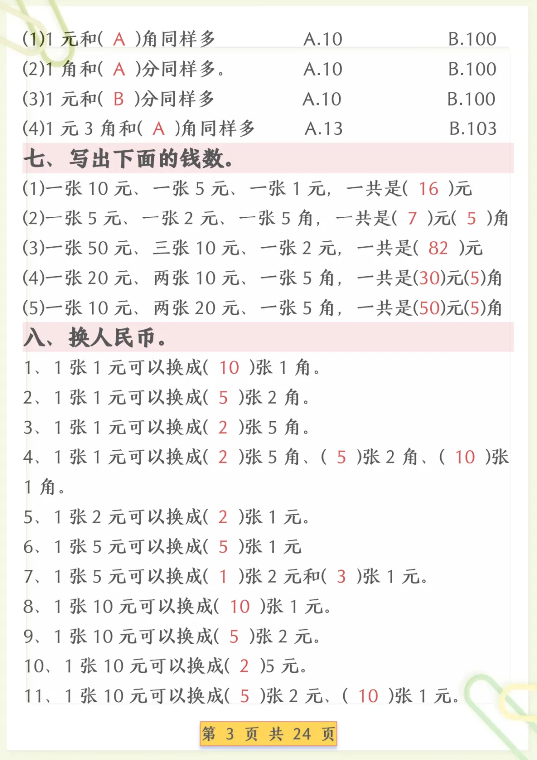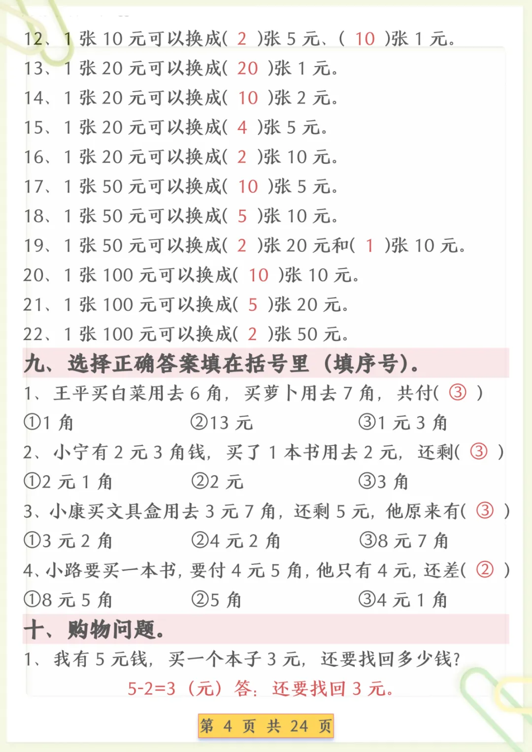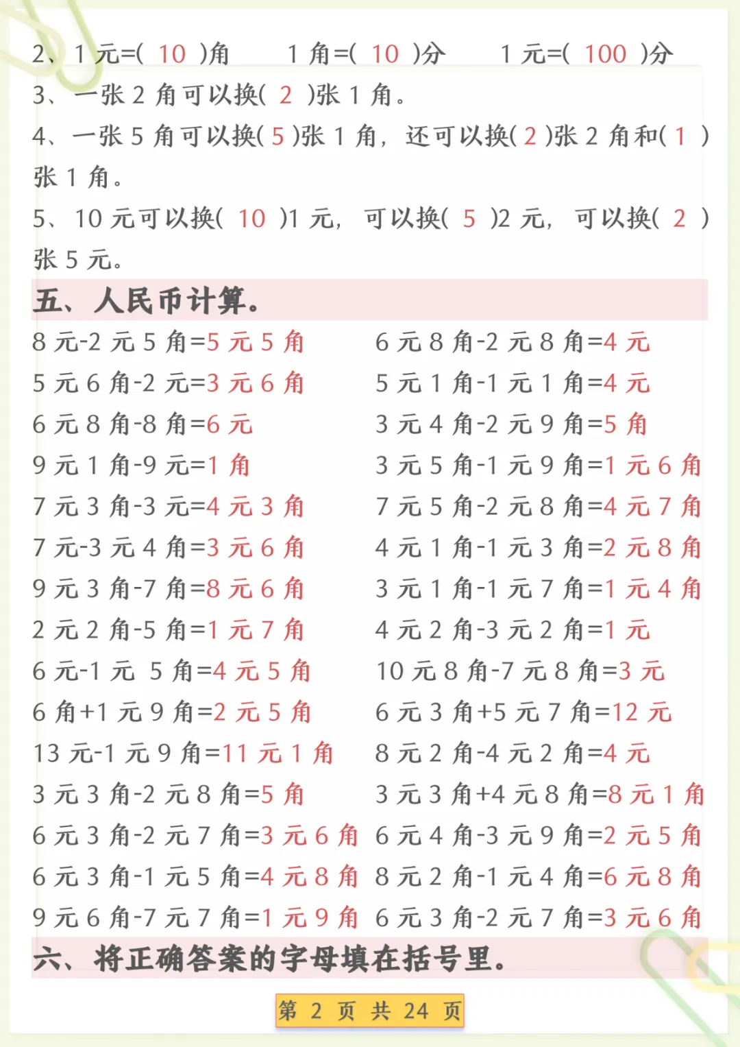 一年级下数学人民币换算专项练习,共24页,电子版可下载可打印,这份资料围绕一年级下册数学中人民币相关内容进行专项训练,帮助孩子熟悉元、角、分的认识与换算,进一步巩固简单计算和生活应用等常见题型,让孩子在练习中逐步理清思路、提升解题能力。需要的家长可以及时下载打印出来,安排孩子练一练,更有针对性地夯实这一单元的基础。