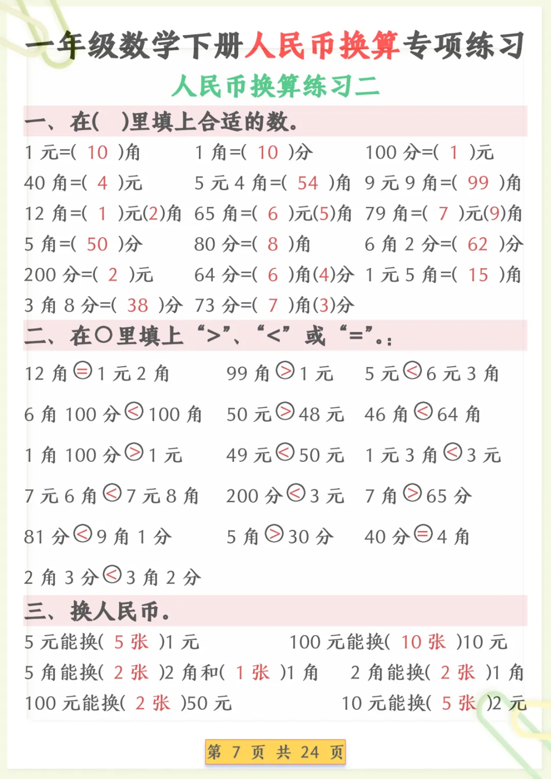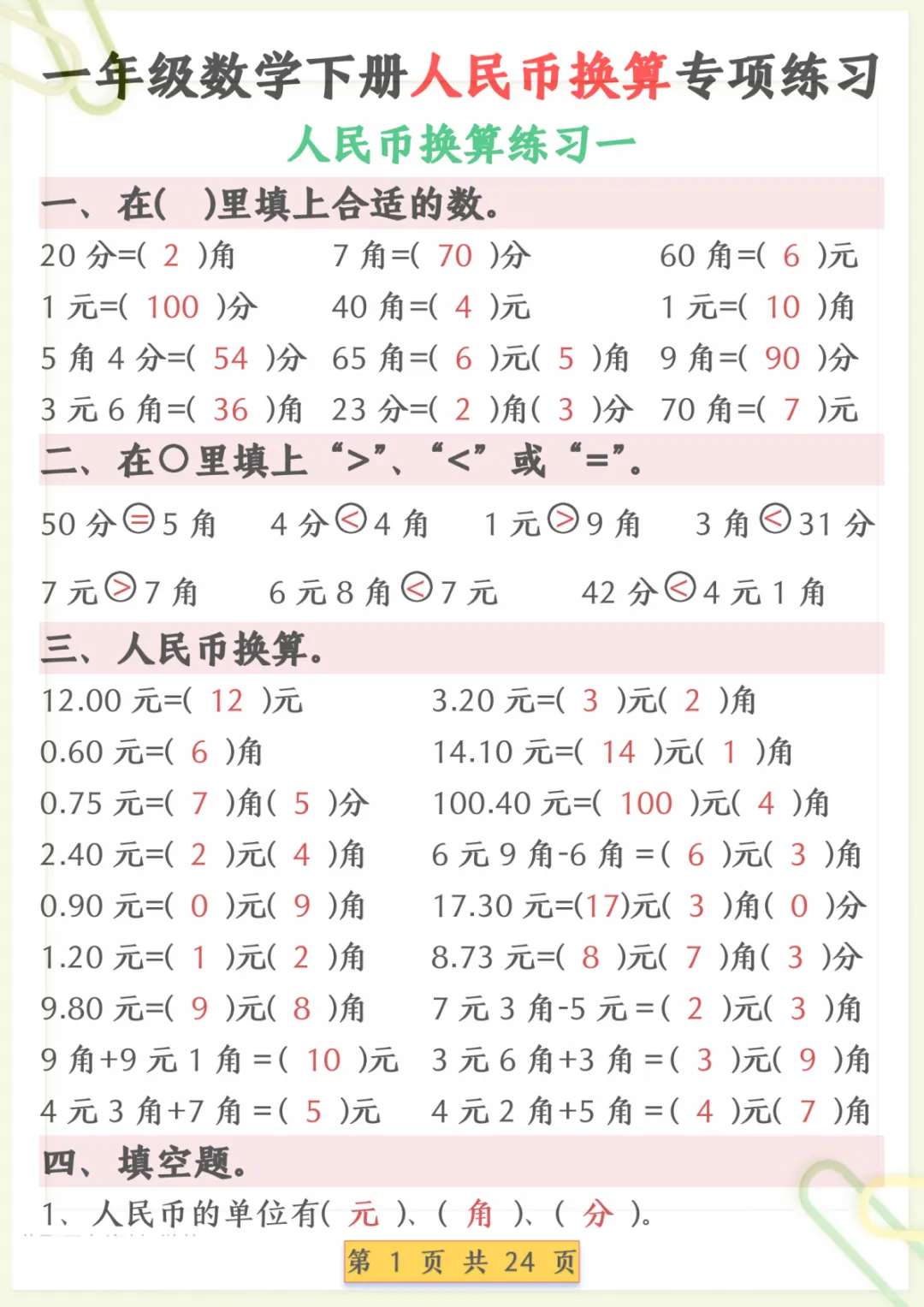 一年级下数学人民币换算专项练习,共24页,电子版可下载可打印,这份资料围绕一年级下册数学中人民币相关内容进行专项训练,帮助孩子熟悉元、角、分的认识与换算,进一步巩固简单计算和生活应用等常见题型,让孩子在练习中逐步理清思路、提升解题能力。需要的家长可以及时下载打印出来,安排孩子练一练,更有针对性地夯实这一单元的基础。