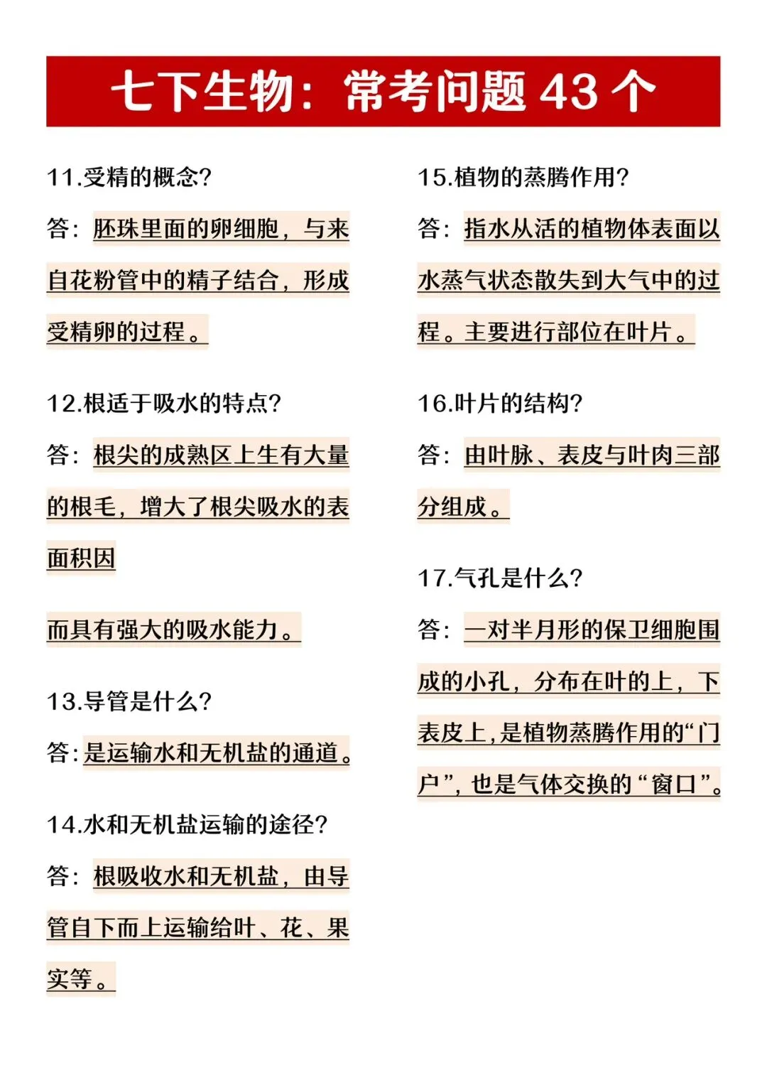 2026七年级下册生物常考43题(电子版可打印)
