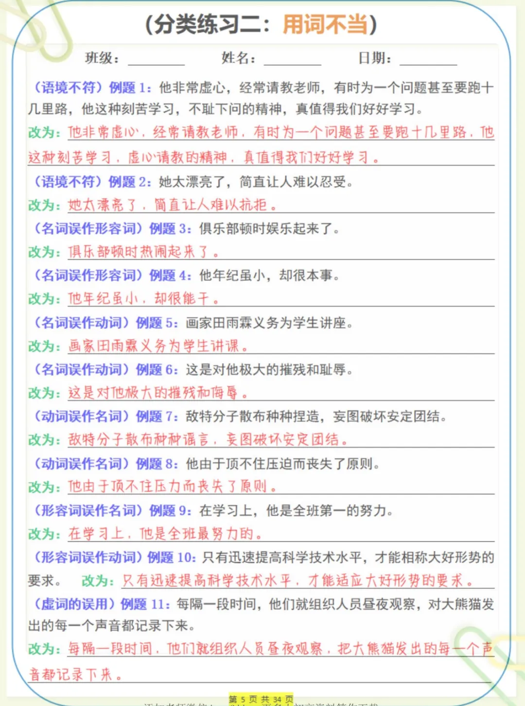 三年级下语文修改病句专项拔高训练小纸条,共34页,电子版可下载可打印,这份专项练习紧扣三年级下册语文常见病句修改训练,围绕句子成分残缺、搭配不当、语序混乱、前后矛盾、重复啰嗦等常见题型进行系统强化,帮助孩子在练习中掌握修改病句的方法与思路,提升句子表达的准确性和语感。需要的家长可以提前保存打印出来,让孩子在课后扎实练一练。
