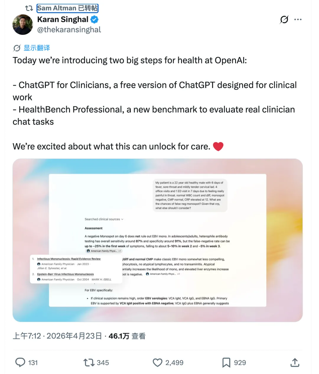 这样的设计很重要,因为医疗场景里,回答是否能被追溯、能否快速核验,往往和回答本身同样关键。官方也明确写到,这个产品用于支持真实临床工作,包括证据回顾、个体化诊断和治疗考虑、文书起草以及患者教育;最终的临床判断责任依然在医生手中。