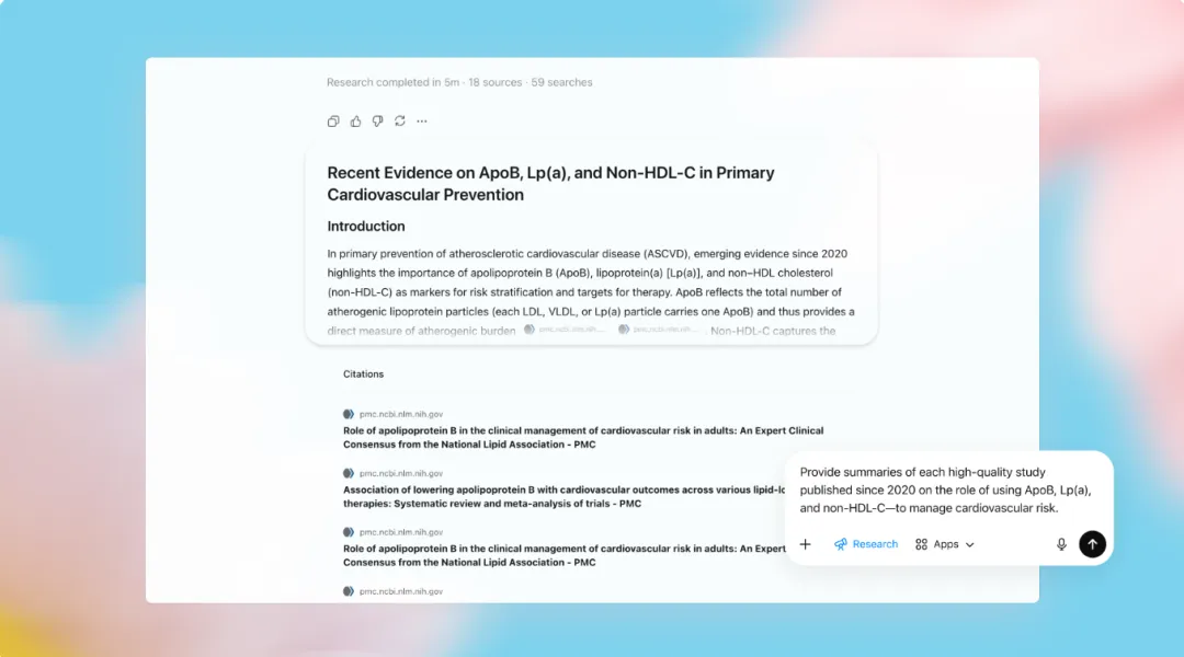 从功能上看,ChatGPT for Clinicians主要强调了这几件事。第一,它提供更适合复杂临床问题的前沿模型;第二,它支持把常见任务做成可复用的workflow,例如转诊信、prior authorization和患者说明;第三,它加入了带引用的trusted clinical search,能够基于同行评议研究、公共卫生指南和临床指南给出实时回答,并清楚列出题目、期刊、作者和发表日期,方便医生继续核查。对于一些需要更深入梳理文献的场景,系统还支持医学期刊上的deep research。