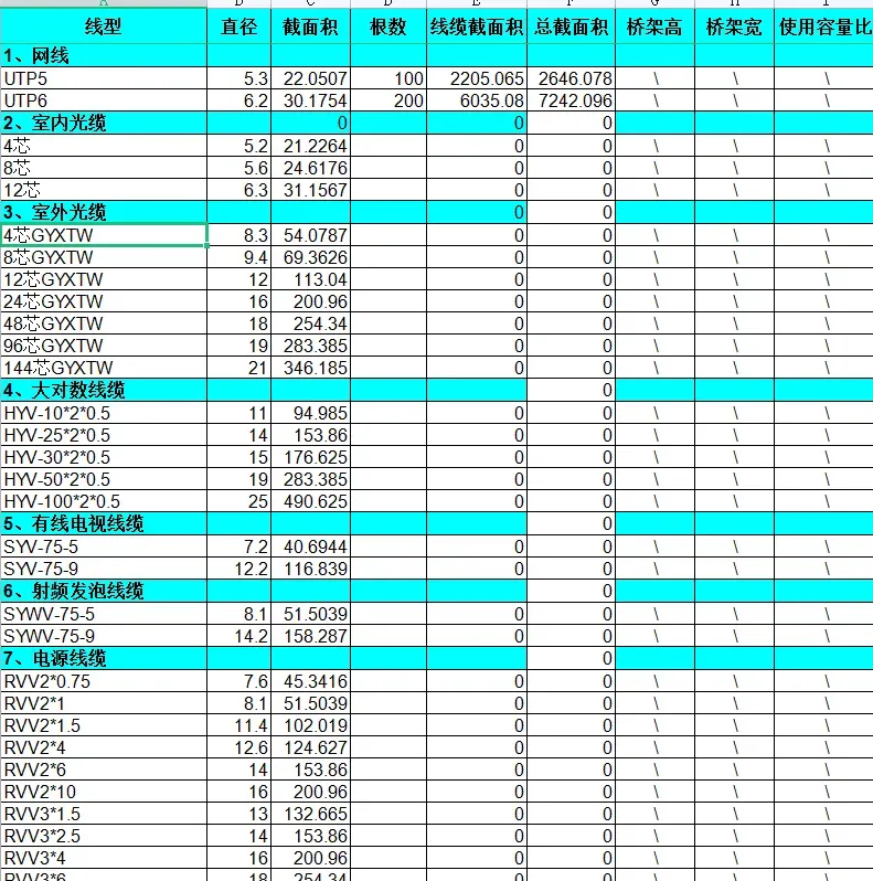 很多售前对桥架的容量设计很是苦恼,因为电缆摆放多少计算公式计算繁琐和实地现场多变的原因,很多售前凭着自己的设计经验给予桥架的容量,造成弱电桥架或者线槽满容量摆放电缆,这些问题给业主留下了不小的用电隐患,也不符合相关规范,给甲方留下不专业的印象。怎么样准确算出桥架容量,最为简便的方式是利用下方的计算表格,根据线型直接输入根数,在最后表格最后一行输入桥架长宽就可以了,十分的方便!