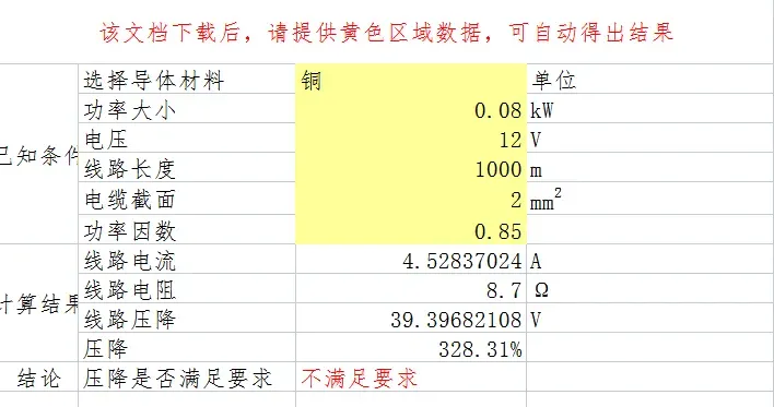 对于距离超过500米的弱电设备,比如摄像头等,在使用的时候,就要考虑压降,好决定用什么线。可直接在下表中黄色区域输入相关数据,可自动得出结果。