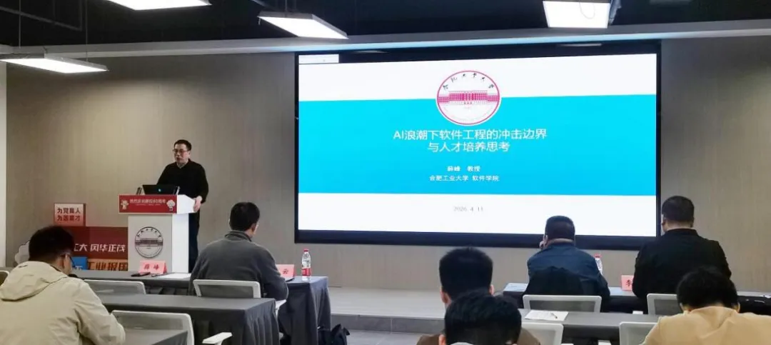 2026 年 4 月 11 日下午,由合肥工业大学软件学院、安徽省人工智能学会联合主办的 “AI 浪潮对计算机软件行业的冲击边界与人才培养” 主题论坛,在合肥工业大学翡翠湖校区顺利举行。省内外高校专家学者、知名企业技术负责人及学院师生代表齐聚一堂,共同探讨 AI 浪潮下计算机软件行业的发展变革与人才培养创新路径。论坛由合肥工业大学软件工程系副主任张高峰主持。