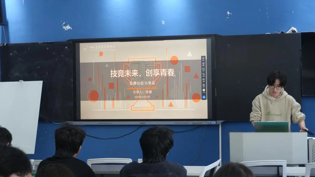 为进一步提升部门成员学科竞赛参与水平,夯实专业实践能力,明确备赛思路与参赛方向。綦江校区网络与信息管理中心软件开发团队于2026年4月22日下午16:00在綦河书院2号楼智慧创享空间开展了以 “技竞未来,创享未来——竞赛经验分享”为主题的分享会。本次分享会由前端组张健同学担任主讲人,共有20余名师生参与。