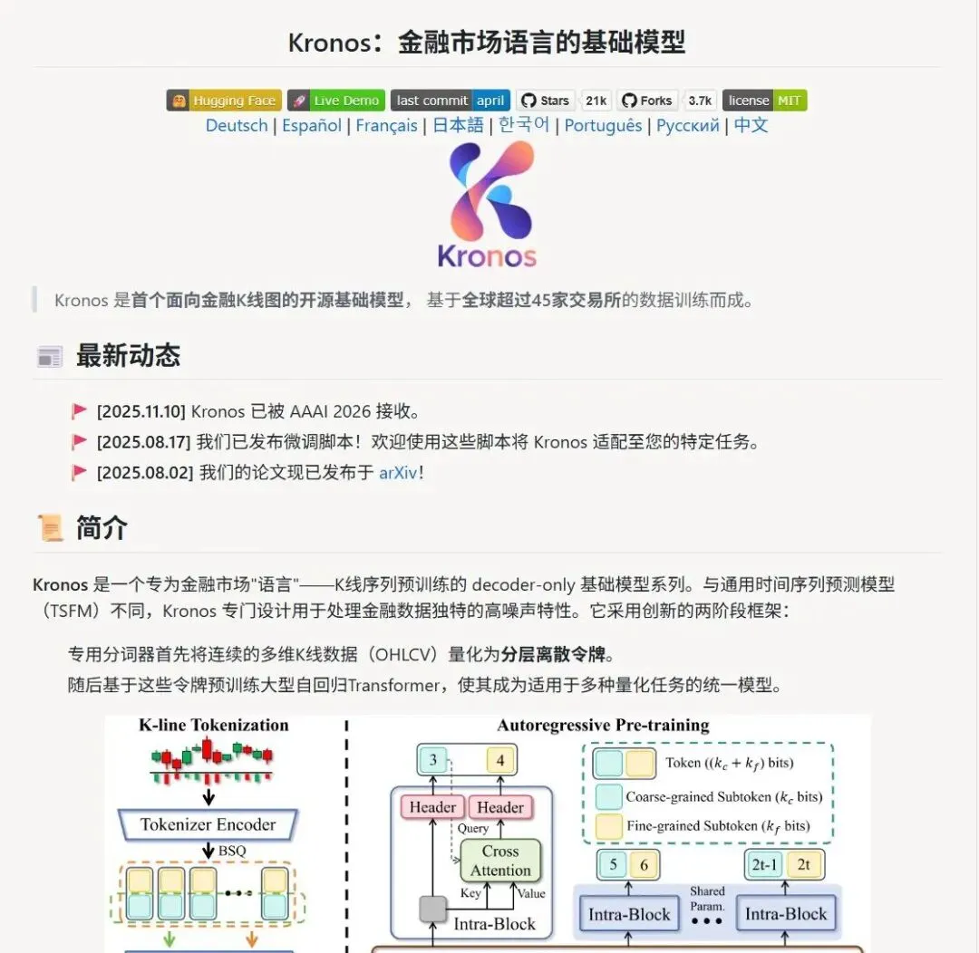 **金融大模型Kronos** 专注于处理复杂的 K 线数据。训练集横跨 **全球45家交易所**,这波数据量简直 📈 强得可怕。顶级顶会收录项目(AI资讯) 彰显了其实力。这种 **自回归模型** 能够精准预测比特币未来二十四小时的走势。现在已经开放在线试玩,量化交易员赶紧去 (๑•̀ㅂ•́)و✧ 围观。