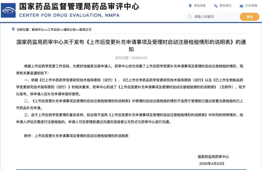 2026年4月23日,CDE发布《上市后变更补充申请事项及受理时启动注册检验情形的说明表》,明确中药、化药、生物制品三大类变更事项的注册检验启动标准,企业可在申报前对照自查。