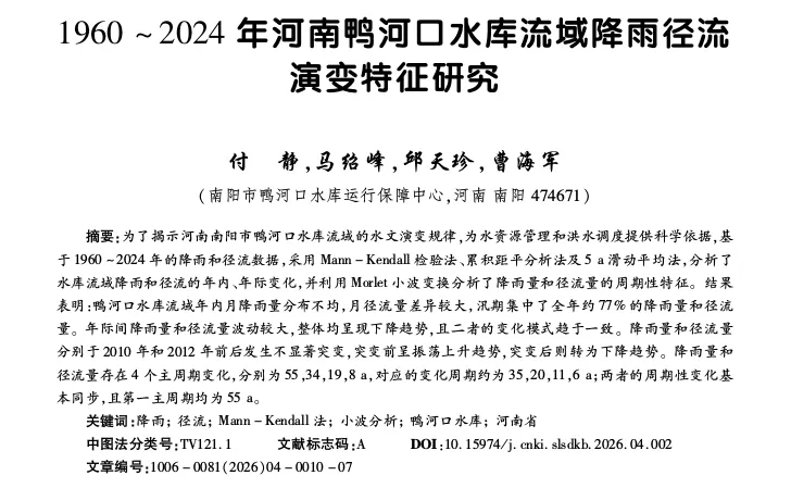1960~2024年河南鸭河口水库流域降雨径流演变特征研究