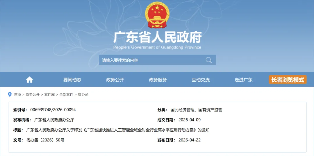 4 月 22 日,广东省政府官网正式发布《广东省加快推进人工智能全域全时全行业高水平应用行动方案》,文件以全域覆盖、全时响应、全行业渗透为核心导向,围绕 “人工智能 +” 布局七大发展方向、63 个细分领域,全面推动人工智能技术深度融入产业发展、城市治理与民生服务,以场景驱动激活新质生产力,全力打造全国人工智能融合应用示范高地。
