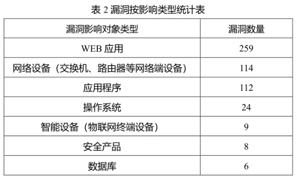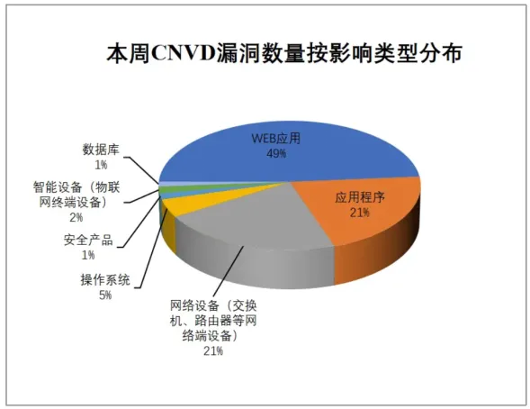 本周收录了583个漏洞。WEB应用221个,应用程序201个,网络设备(交换机、路由器等网络端设备)118个,数据库17个,操作系统12个,安全产品7个,智能设备(物联网终端设备)6个,区块链1个,如表2、图2、表3所示。