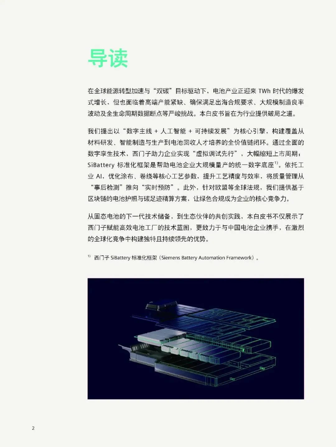 本白皮书核心:全球电池产业进入TWh 时代,在能源转型与双碳驱动下高速增长,但面临高端产能不足、出海合规、良率波动、数据孤岛、降本与可持续等多重挑战;西门子以数字主线 + AI + 可持续为核心,用数字孪生、SiBattery 标准化框架、工业 AI、碳足迹与电池护照、全生命周期管理等方案,覆盖电池研发、制造、回收、人才培养全价值链,助力企业提质、降本、提速、合规出海,并布局固态电池等下一代技术,联合生态伙伴打造数字化共同体。