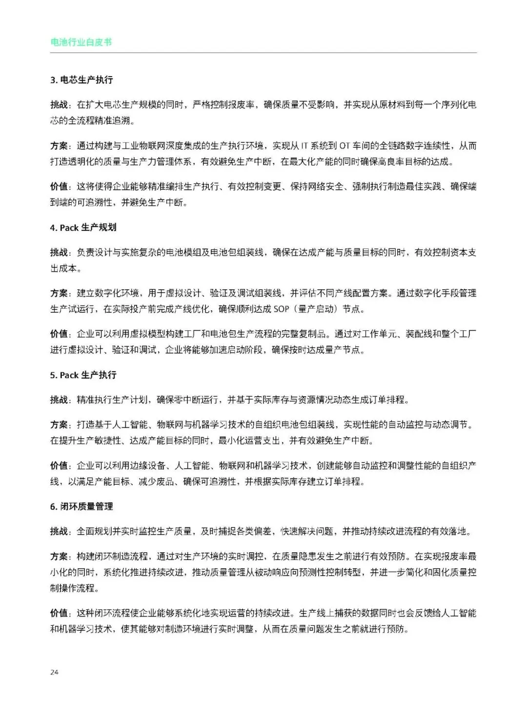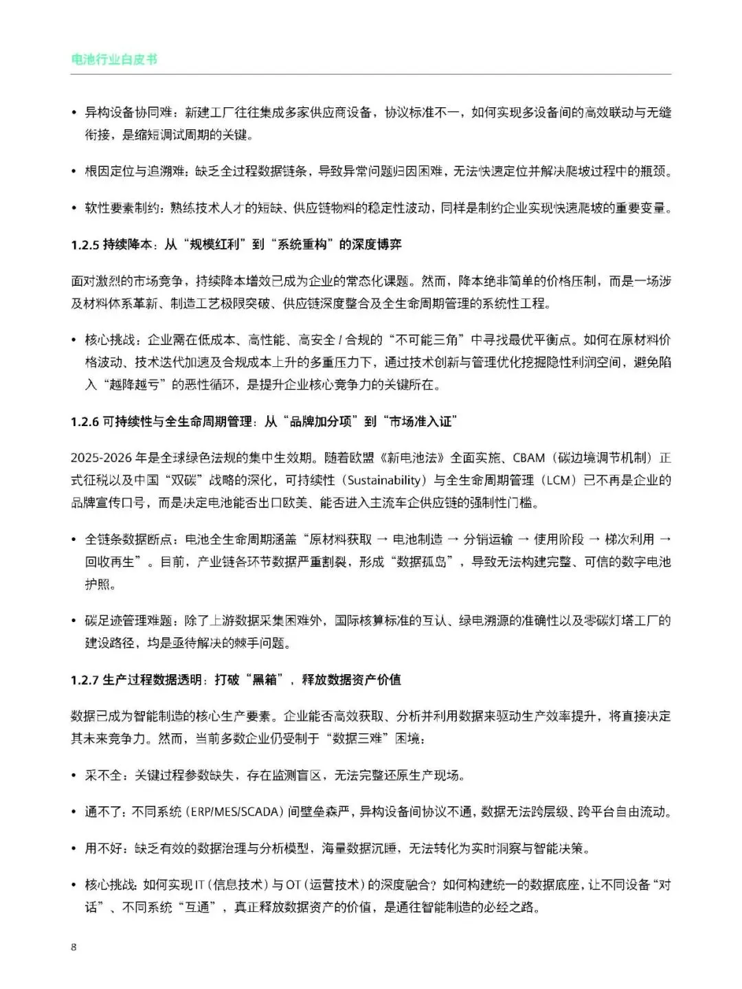高端产能紧缺、中低端过剩;出海面临地缘政治与欧盟新电池法等合规壁垒;大规模量产良率与一致性难控;新产线爬坡慢;持续降本压力大;全生命周期碳足迹与回收合规刚需;生产数据不透明、IT/OT 割裂。