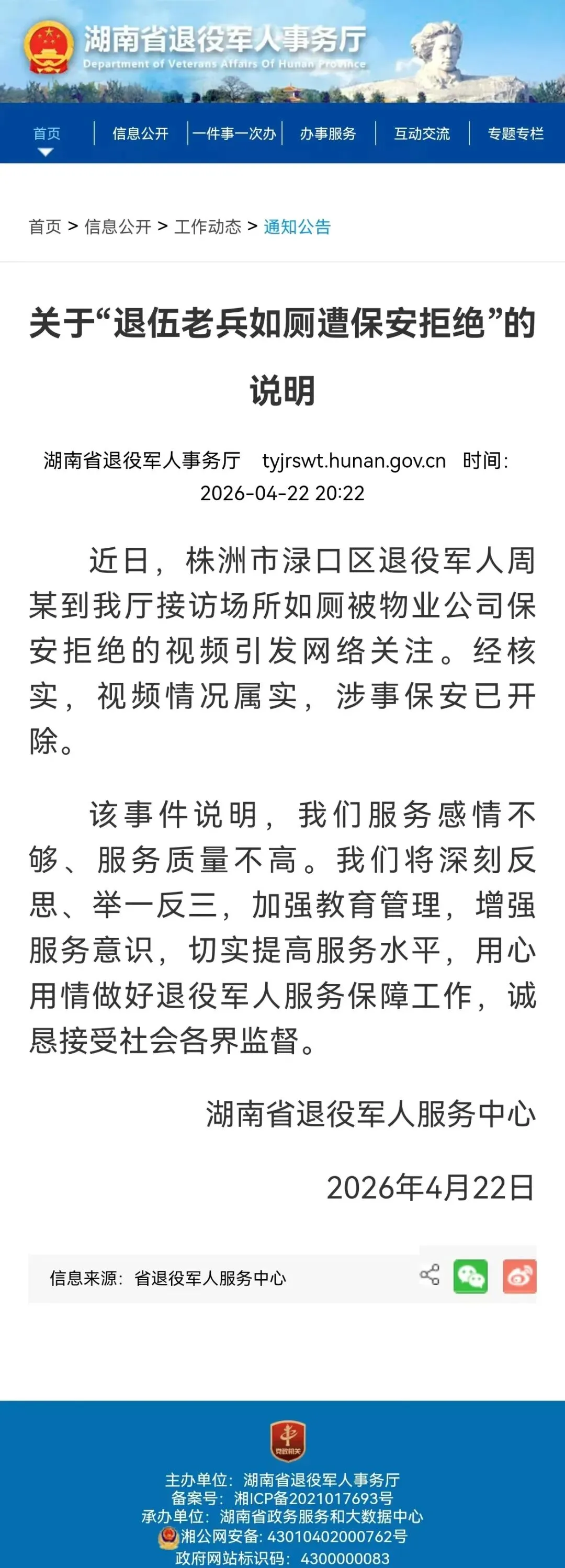 近日,株洲市渌口区退役军人周某到湖南省退役军服务中心所属接访场所如厕被物业公司保安拒绝的视频引发网络关注。经核实,视频情况属实,涉事保安已开除。官方说明如下: