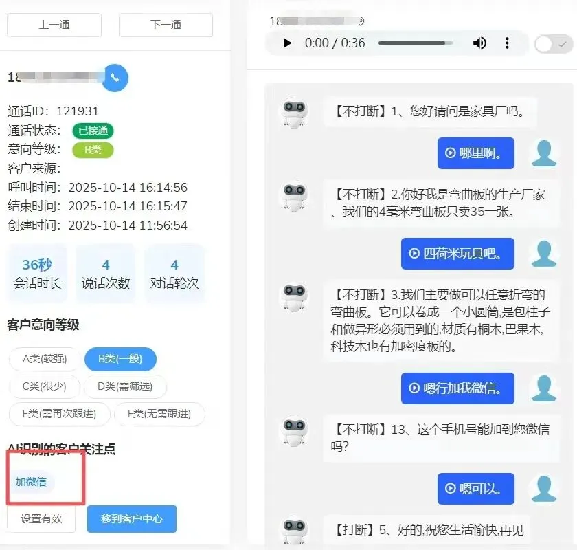 3、意向客户精准分类。机器人根据呼叫结果自动筛选,直接根据客户意愿强弱区分跟进优先级,帮助企业沉淀出高质量客户,以便快速达成交易。