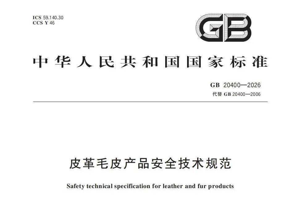 下载 | GB 20400—2026《皮革毛皮产品安全技术规范》强制性国家标准 GB 20400—2026 皮革毛皮产品安全技术规范 2027年4月1日实施 下载 声明: 部分图文信息来源互联网,版权归属原作者。本公众号为学习交流平台,并不用于商业目的。如有侵权请及时告知,经核实后删除;内容为作者个人观点,并不代表本公众号赞同其观点。仅供学习、参考之用,不对信息的准确性、可靠性或完整性做任何保证;联系/投稿合作:cnfzjc@126.com