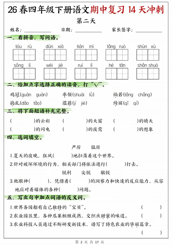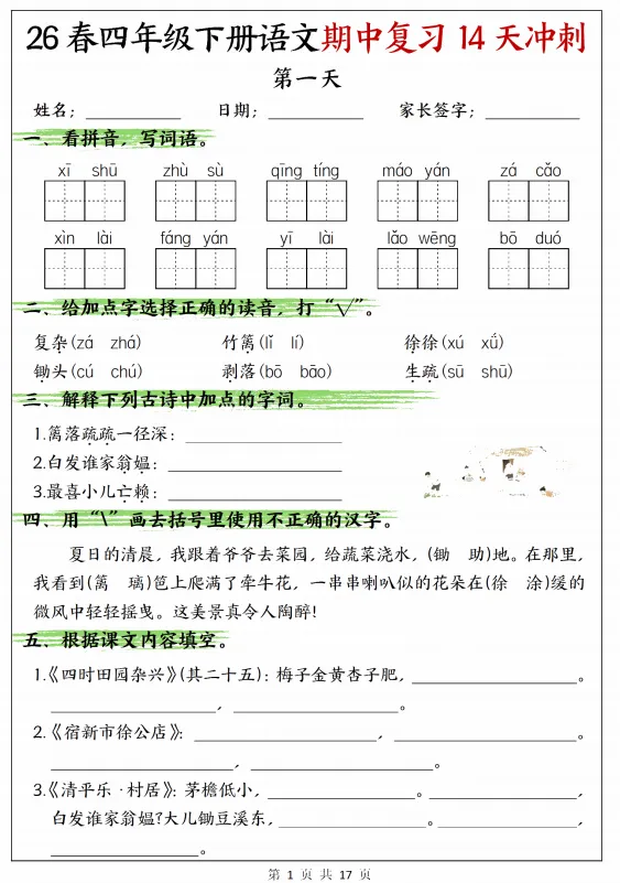 26新四年级下册语文期中复习14天冲刺,电子版可打印 今天分享的是26新四年级下册语文期中复习14天冲刺,提供电子版,支持打印和下载。 (温馨提示:文末有完整电子版领取方式) 免费领取完整电子版: ①:关注下方公众号:学习升华网 ②:在公众号对话框中回复:5082 重要事情说三遍: 关注公众号《学习升华网》,在公众号后台回复代码,不是在文章里面留言!! 关注公众号《学习升华网》,在公众号后台回复代码,不是在文章里面留言!! 关注公众号《学习升华网》,在公众号后台回复代码,不是在文章里面留言!!