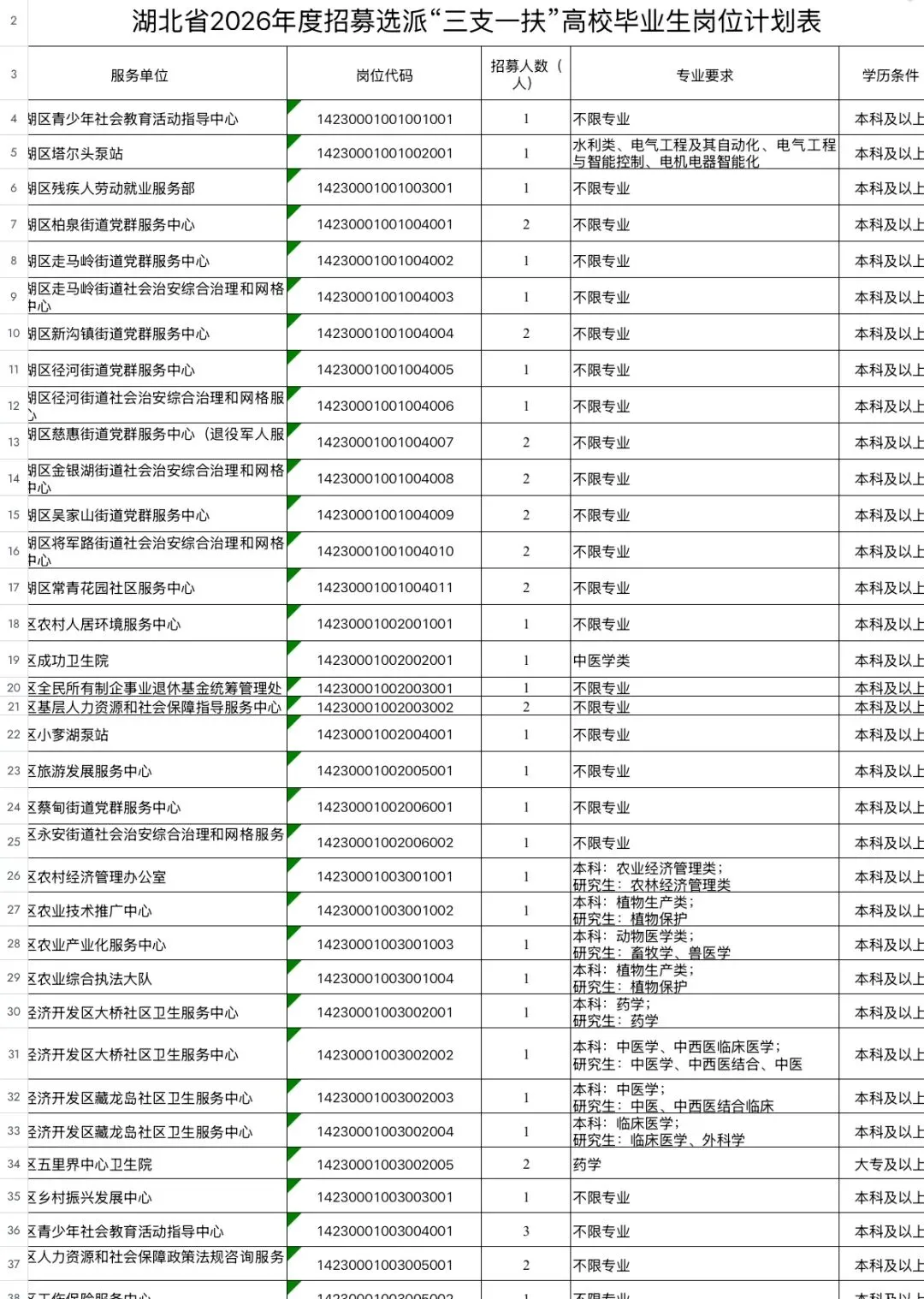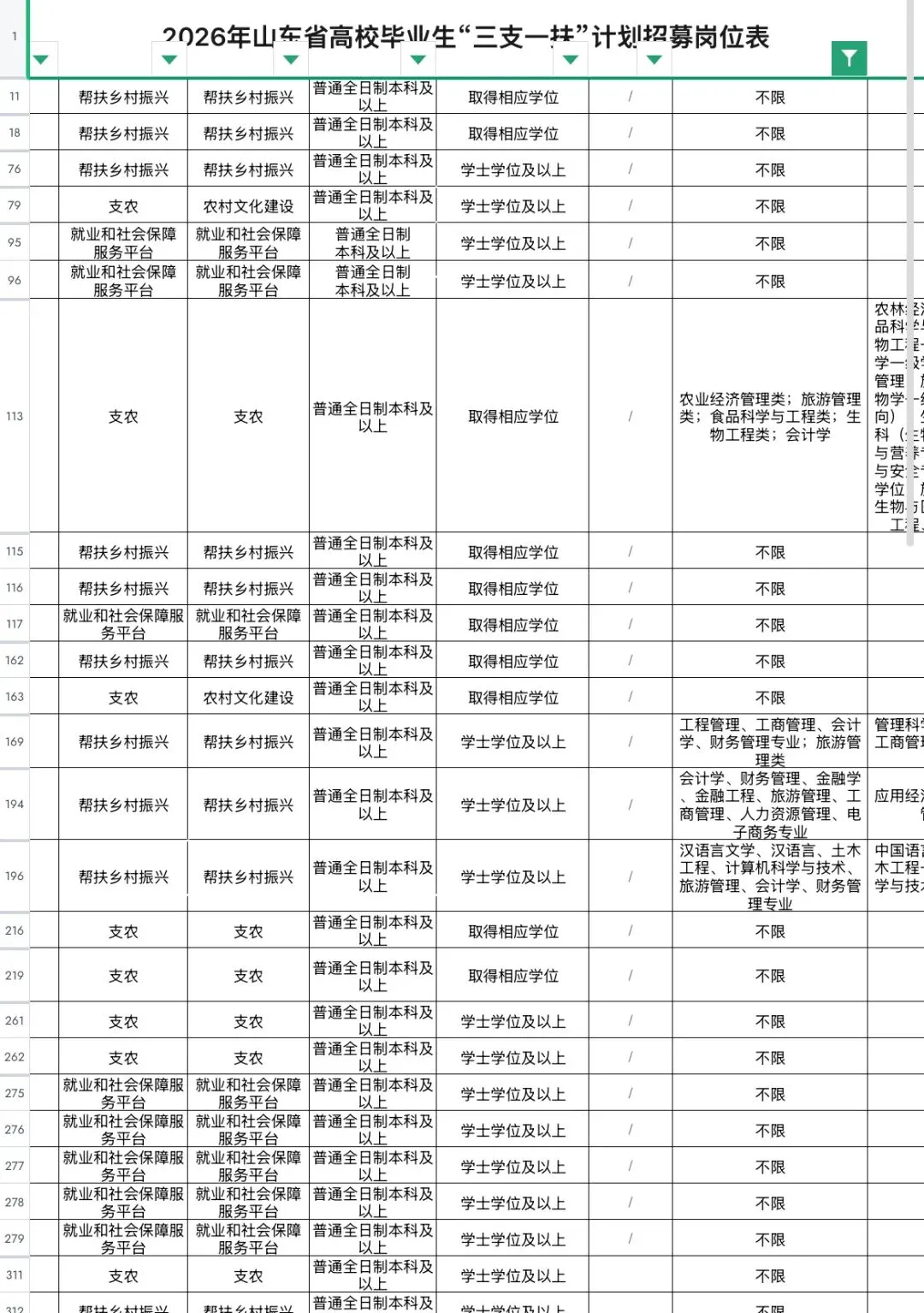 2026年(全国各省市)三支一扶职位表,电子版PDF